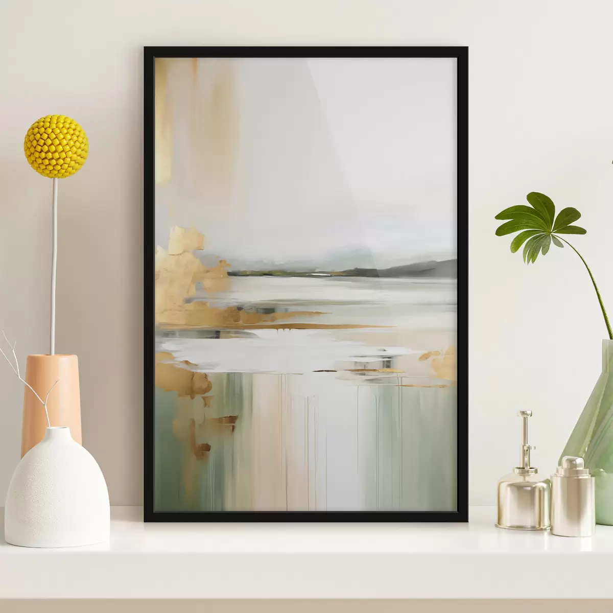 Poster Peisaj abstract în tonuri de galben și verde, apă care reflectă cerul și munții îndepărtați, cer palid și încețoșat Nr f47438