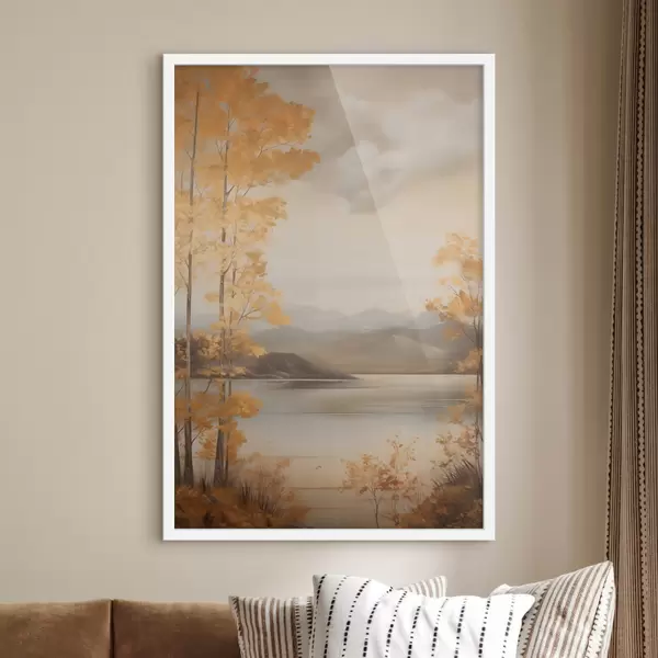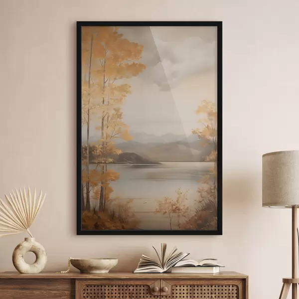 Poster Copacii cu frunze portocalii, specifici toamnei, încadrează un lac liniștit, cu munți îndepărtați, sub un cer înnorat. Nr f47441
