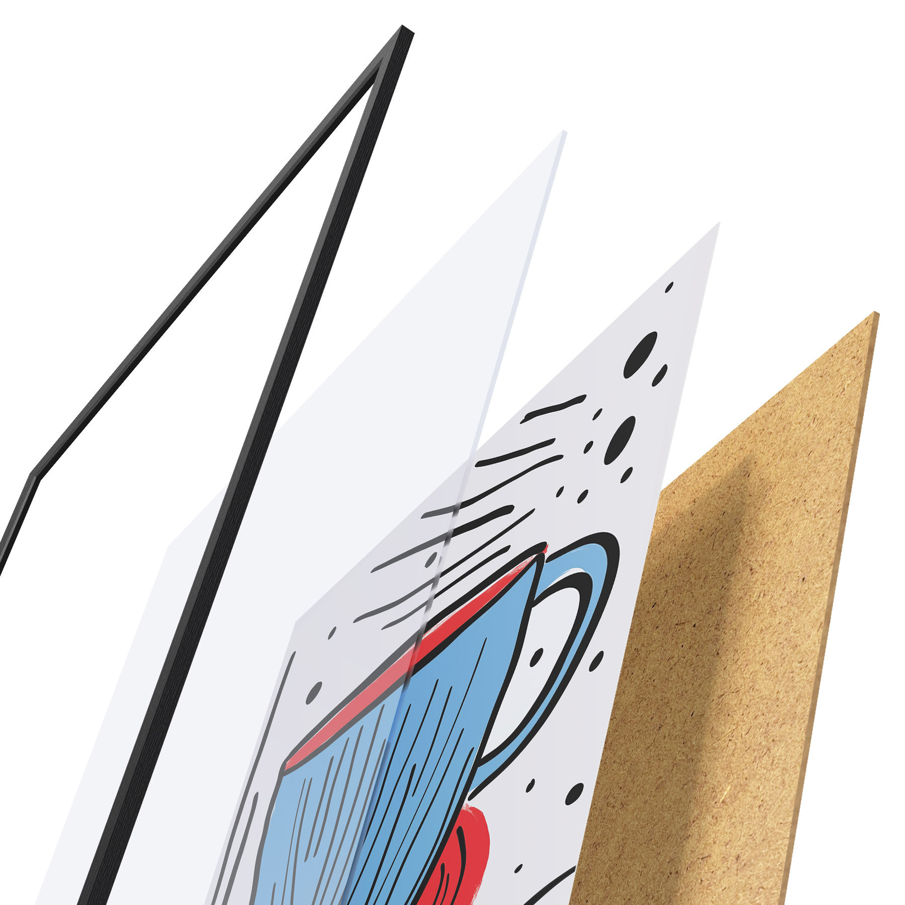 Afișul constă dintr-o ramă, plexiglas, imagine imprimată și suport din PAL. Posterul poate fi agățat imediat pe perete datorită suporturilor de pe spate.