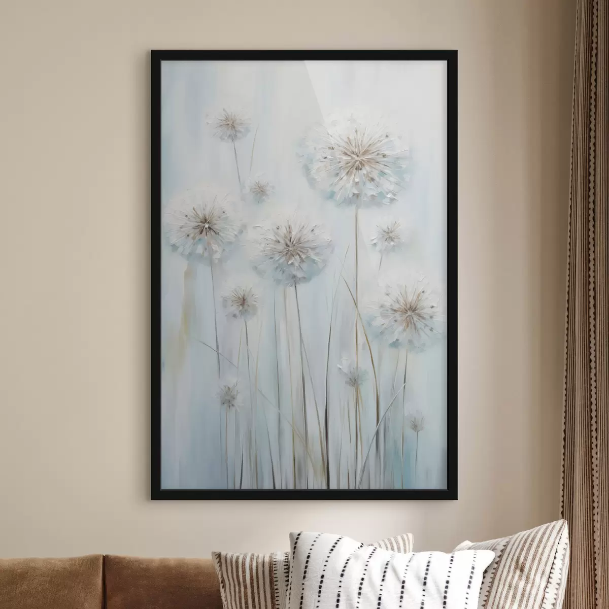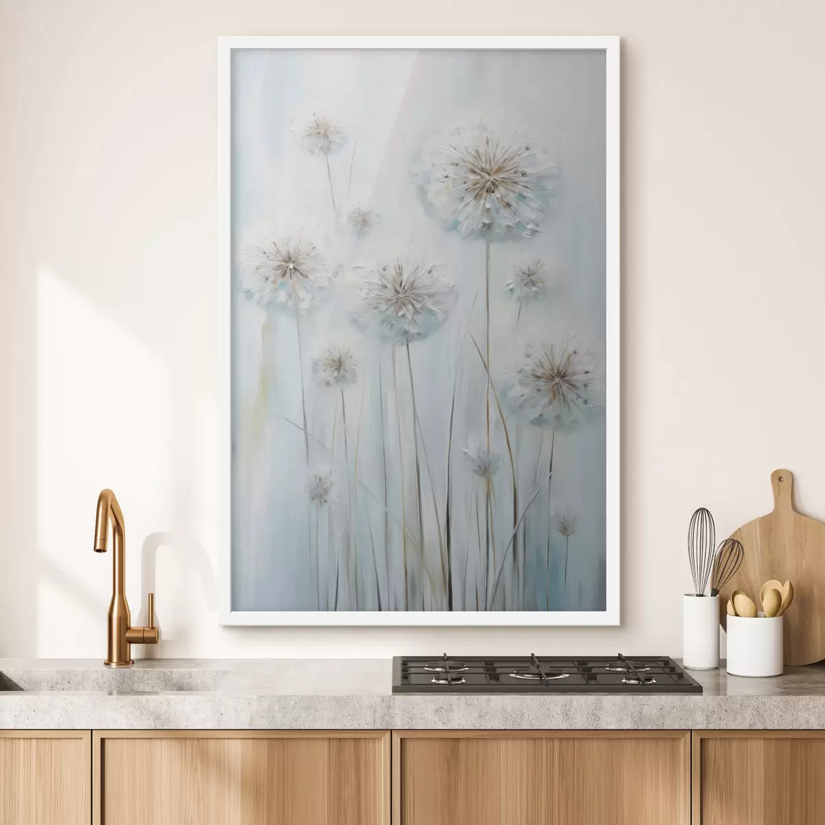 Poster Stil de pictură texturat cu păpădii pe un fundal albastru și alb delicat f47856