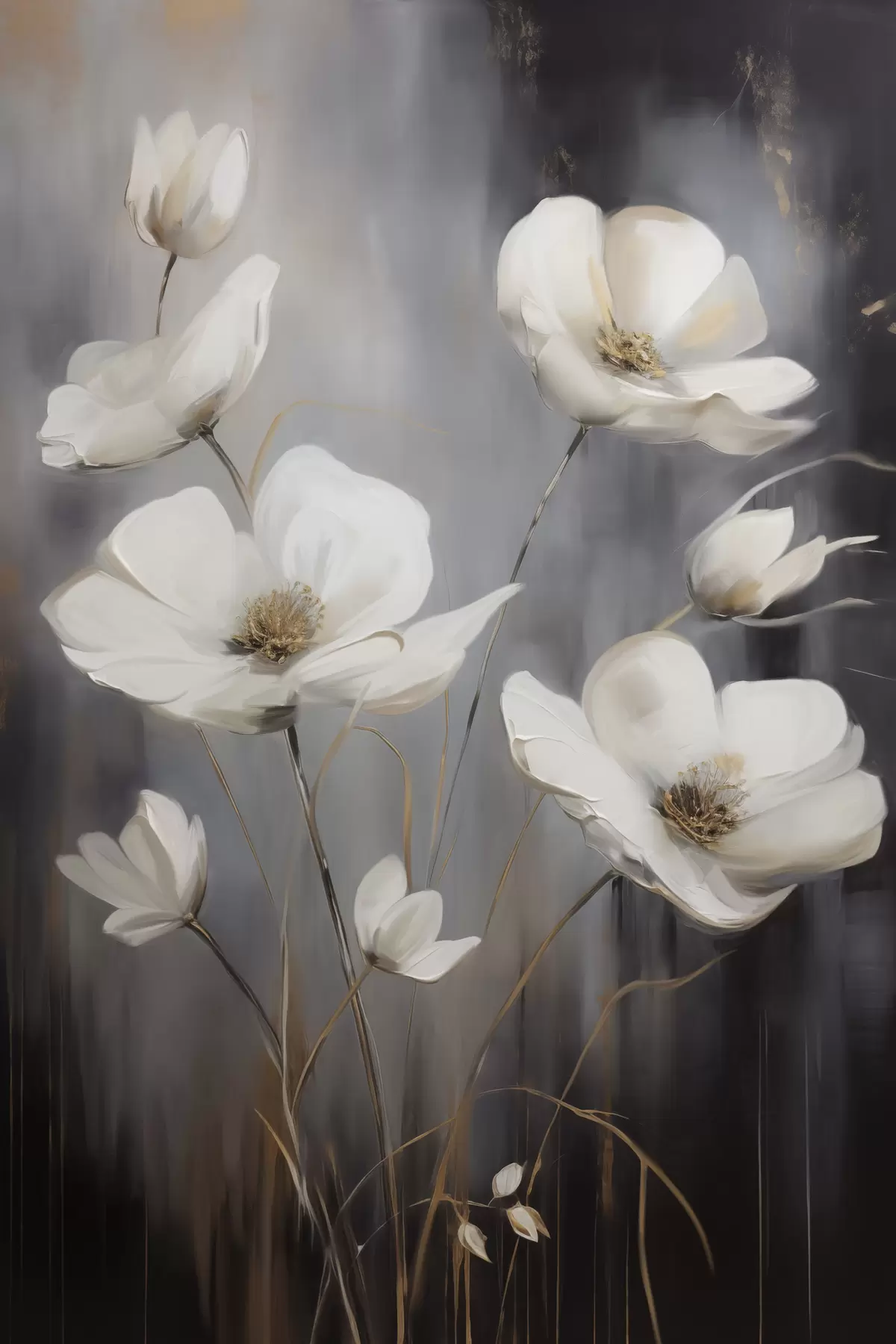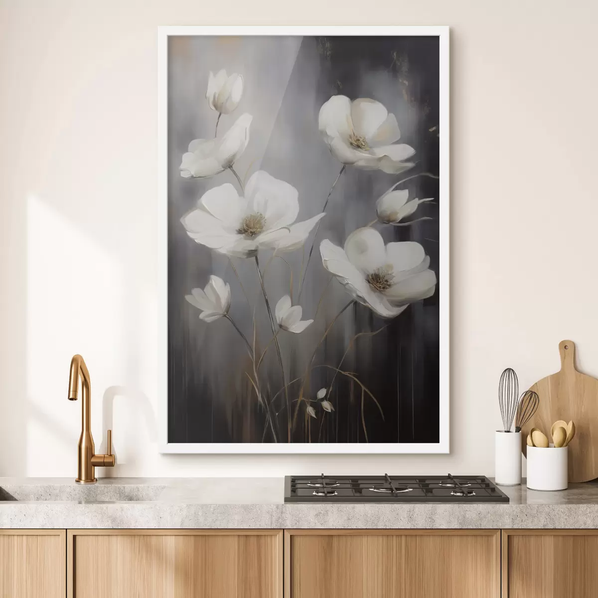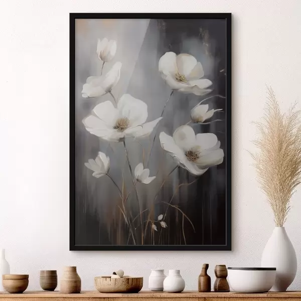 Poster Flori albe cu mijlocul maro și tulpini subțiri pe un fundal întunecat, texturat Nr f47858