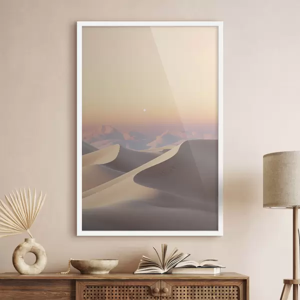 Poster Un peisaj deșertic cu dune de nisip ondulate sub un cer pastelat, munți îndepărtați în fundal Nr f47865