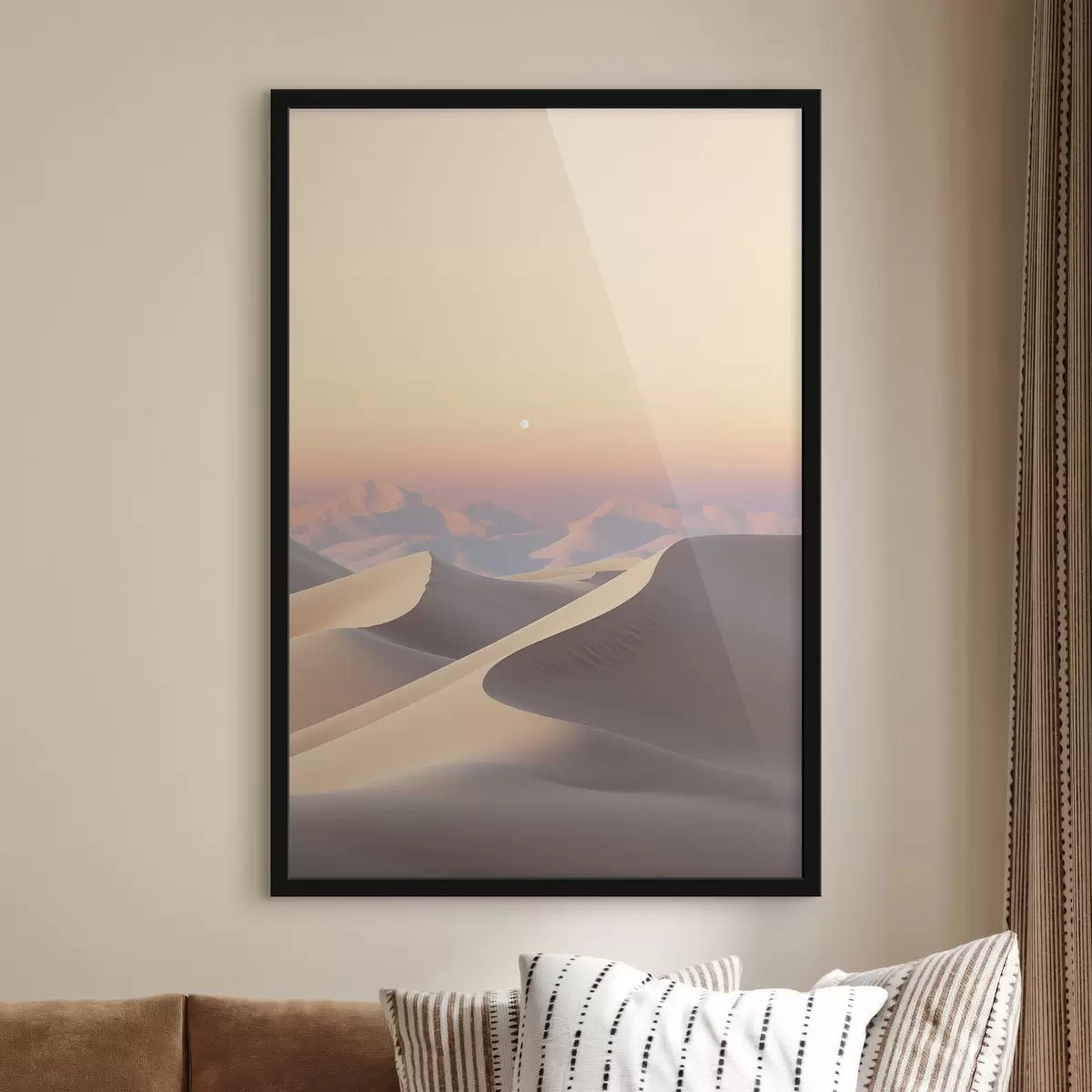 Poster Un peisaj deșertic cu dune de nisip ondulate sub un cer pastelat, munți îndepărtați în fundal f47865