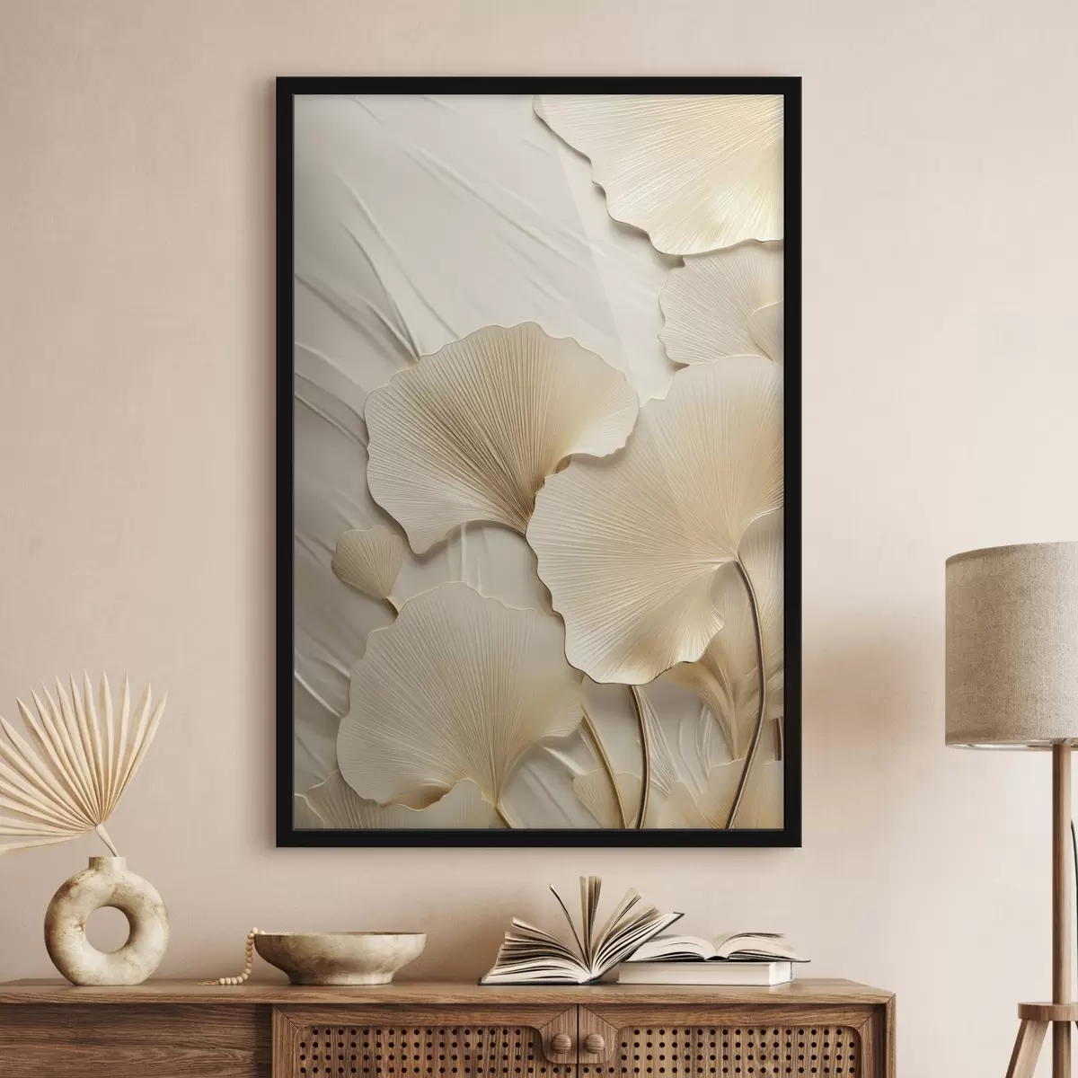 Poster Frunze abstracte de ginkgo pe un fundal texturat, deschis la culoare, compoziție elegantă și abstractă f47867
