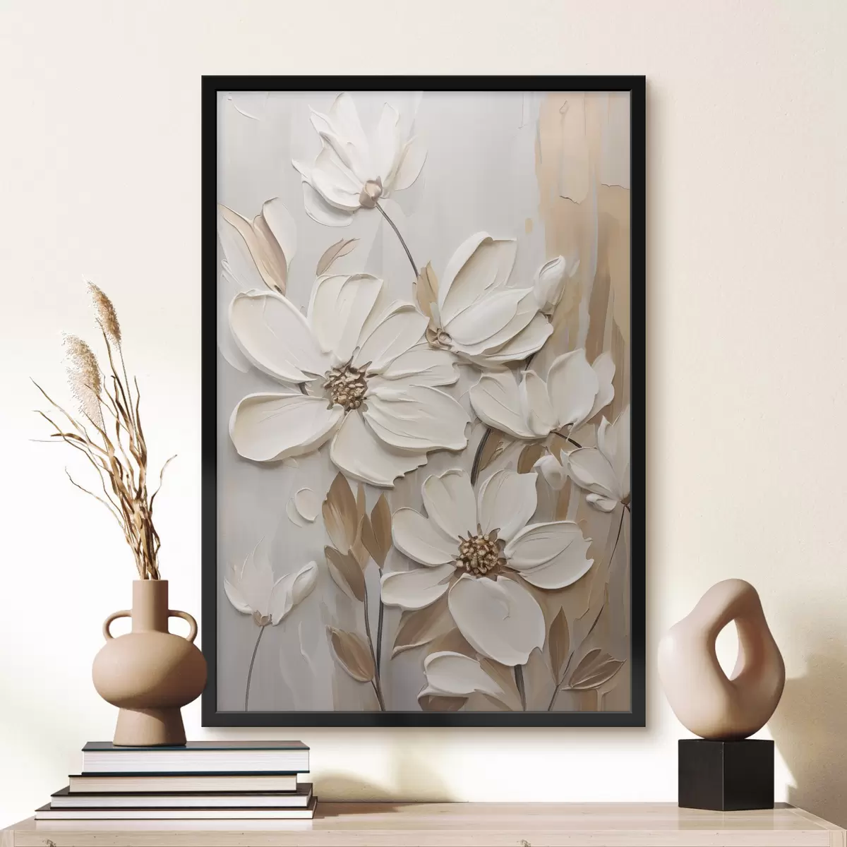 Poster Flori albe abstracte cu petale texturate, pe un fundal neutru cu imitații subtile de pensule f47873