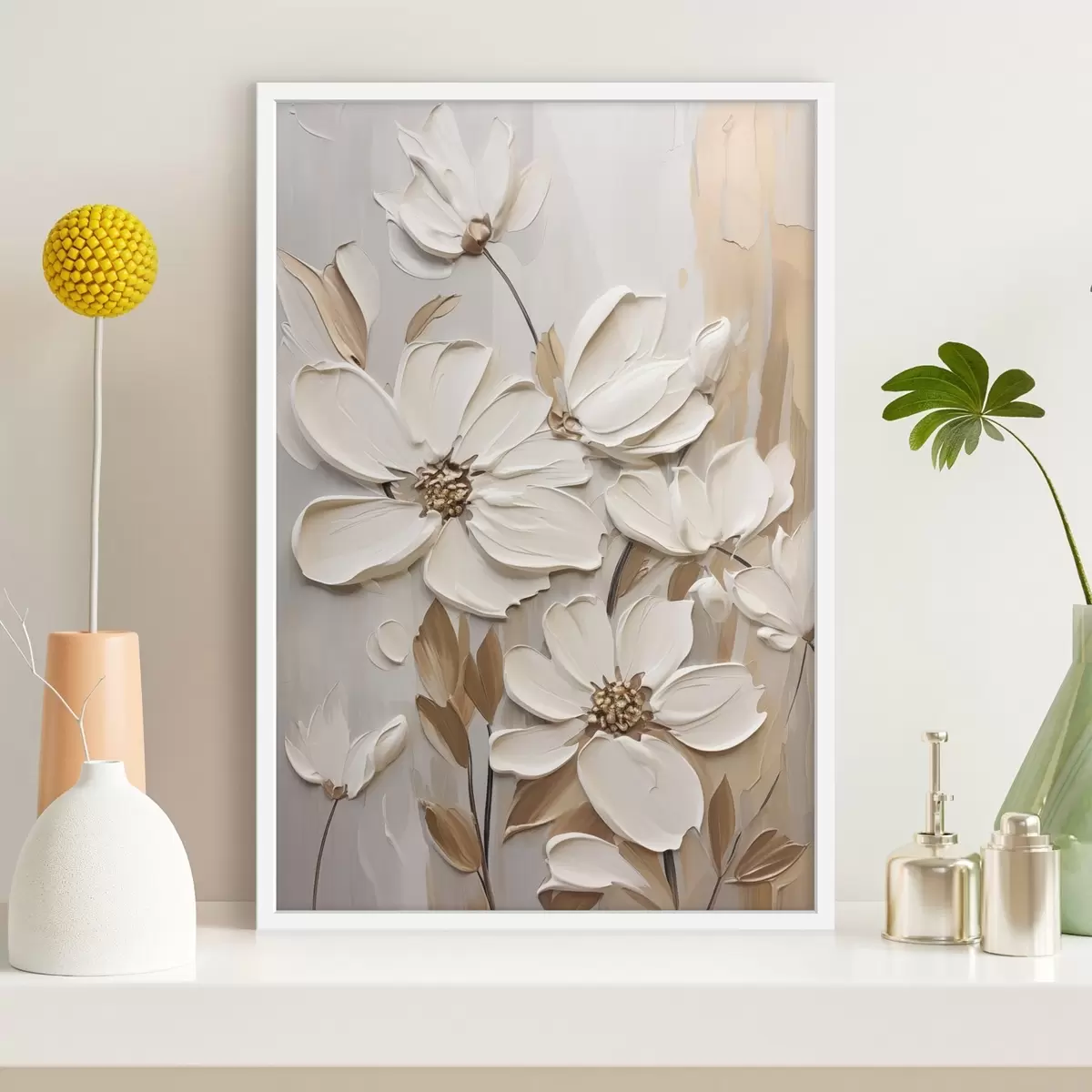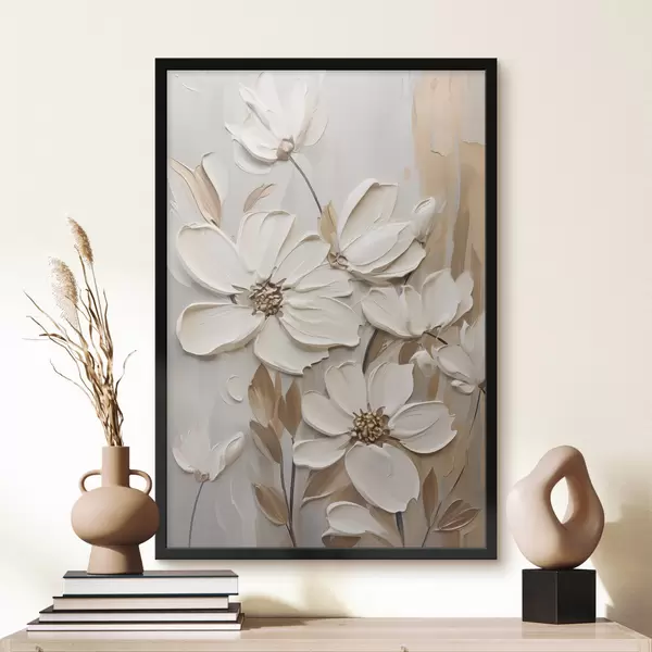 Poster Flori albe abstracte cu petale texturate, pe un fundal neutru cu imitații subtile de pensule Nr f47873