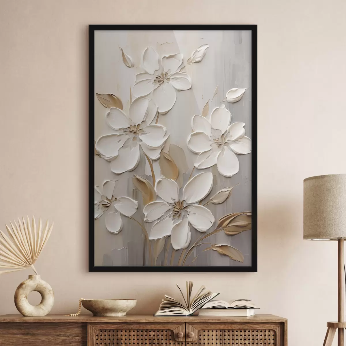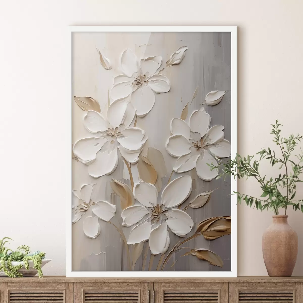 Poster Flori albe abstracte cu petale texturate, pe un fundal neutru cu imitații subtile de pensule Nr f47874