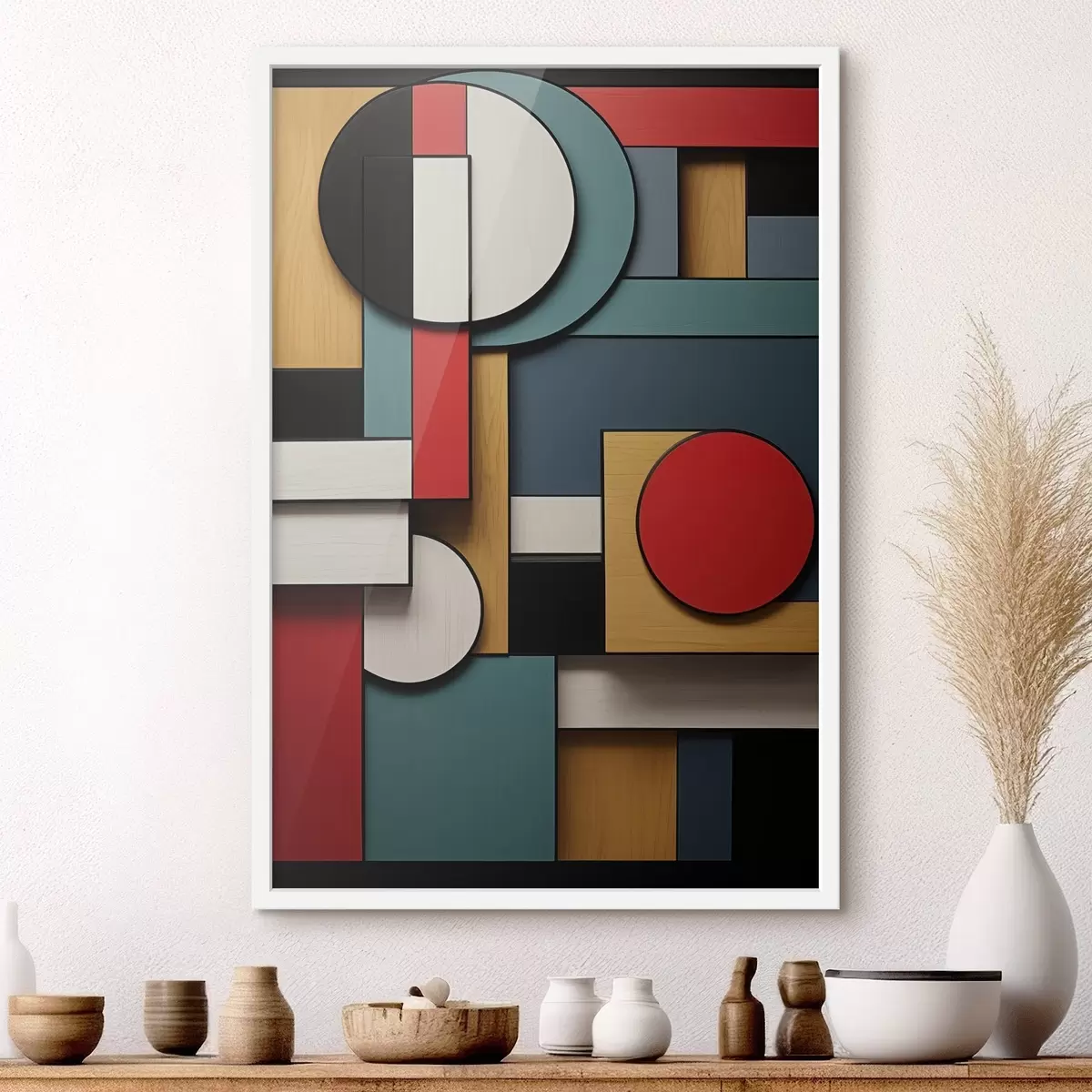 Poster Compoziție geometrică abstractă cu imitație de textură de lemn, dreptunghiuri și cercuri roșii, negre, albe și verde-albăstrui f47875