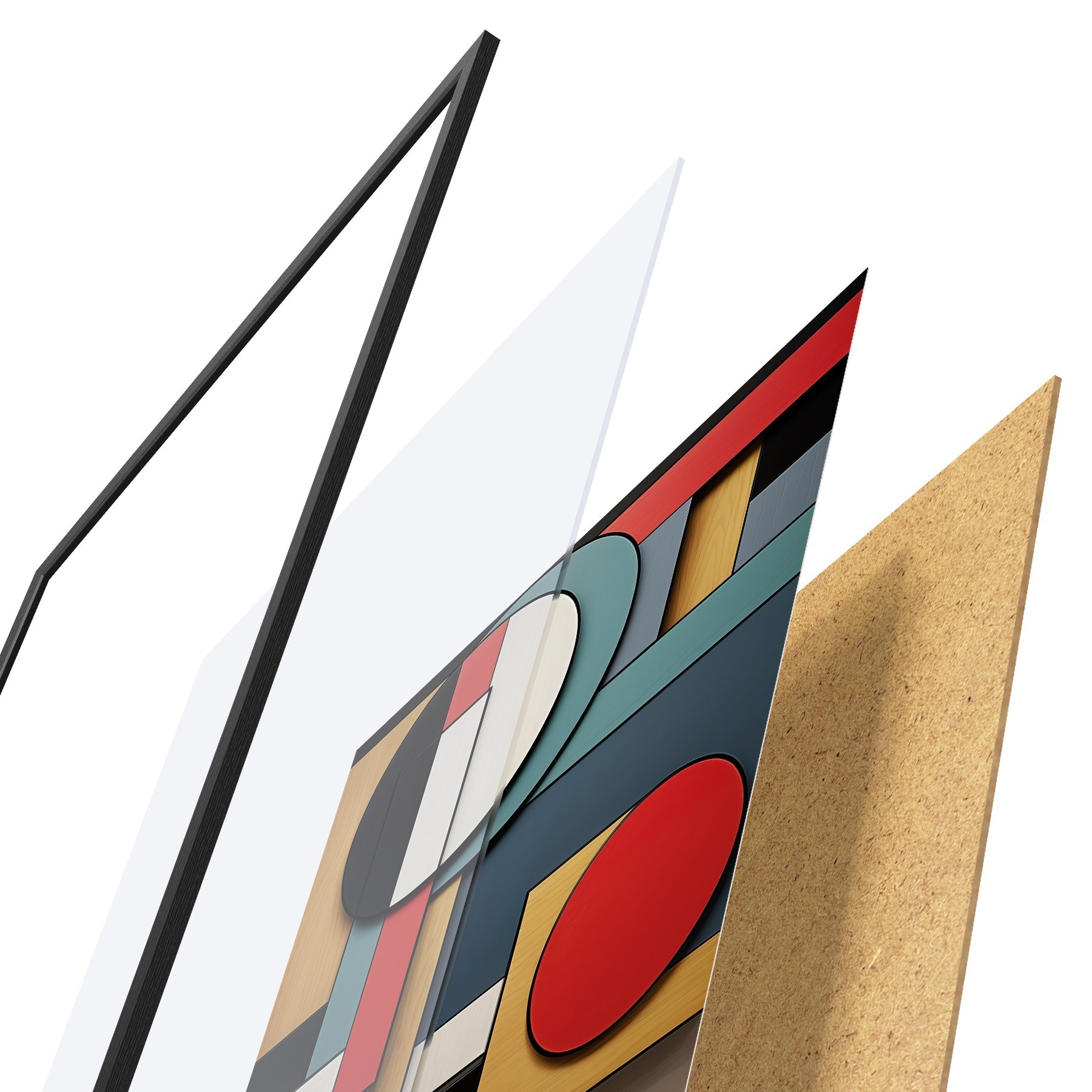 Poster Compoziție geometrică abstractă cu imitație de textură de lemn, dreptunghiuri și cercuri roșii, negre, albe și verde-albăstrui Nr f47875