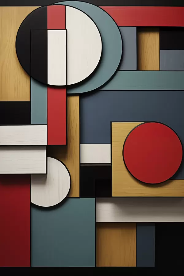 Poster Compoziție geometrică abstractă cu imitație de textură de lemn, dreptunghiuri și cercuri roșii, negre, albe și verde-albăstrui Nr f47875