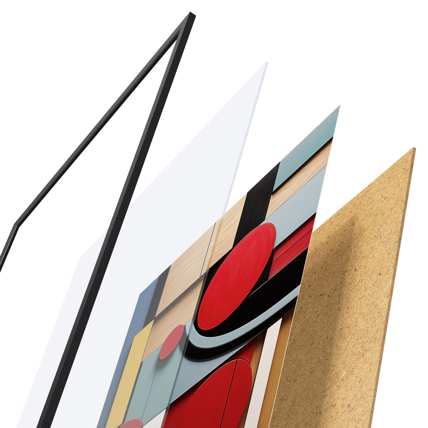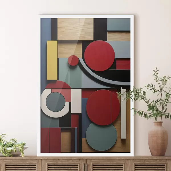 Poster Compoziție geometrică abstractă cu imitație de textură de lemn, dreptunghiuri și cercuri roșii, negre, albe și verde-albăstrui Nr f47876