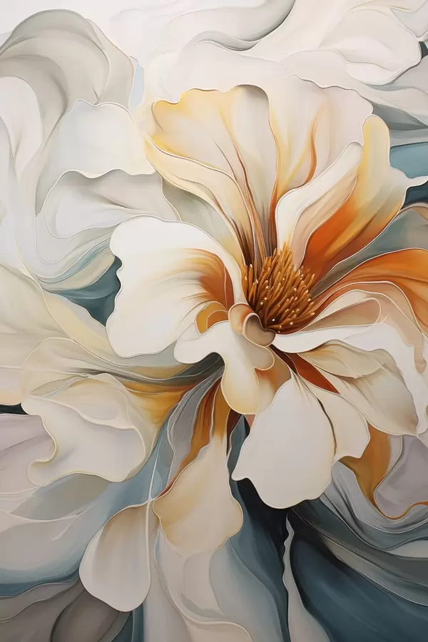 Poster Floare abstractă mare cu petale albe, portocalii și verde-albăstrui, fundal texturat Nr f47877