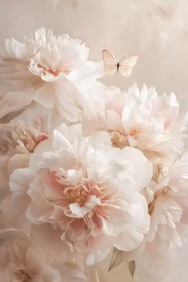 Poster bujori roz luxurianți cu un fluture f47954