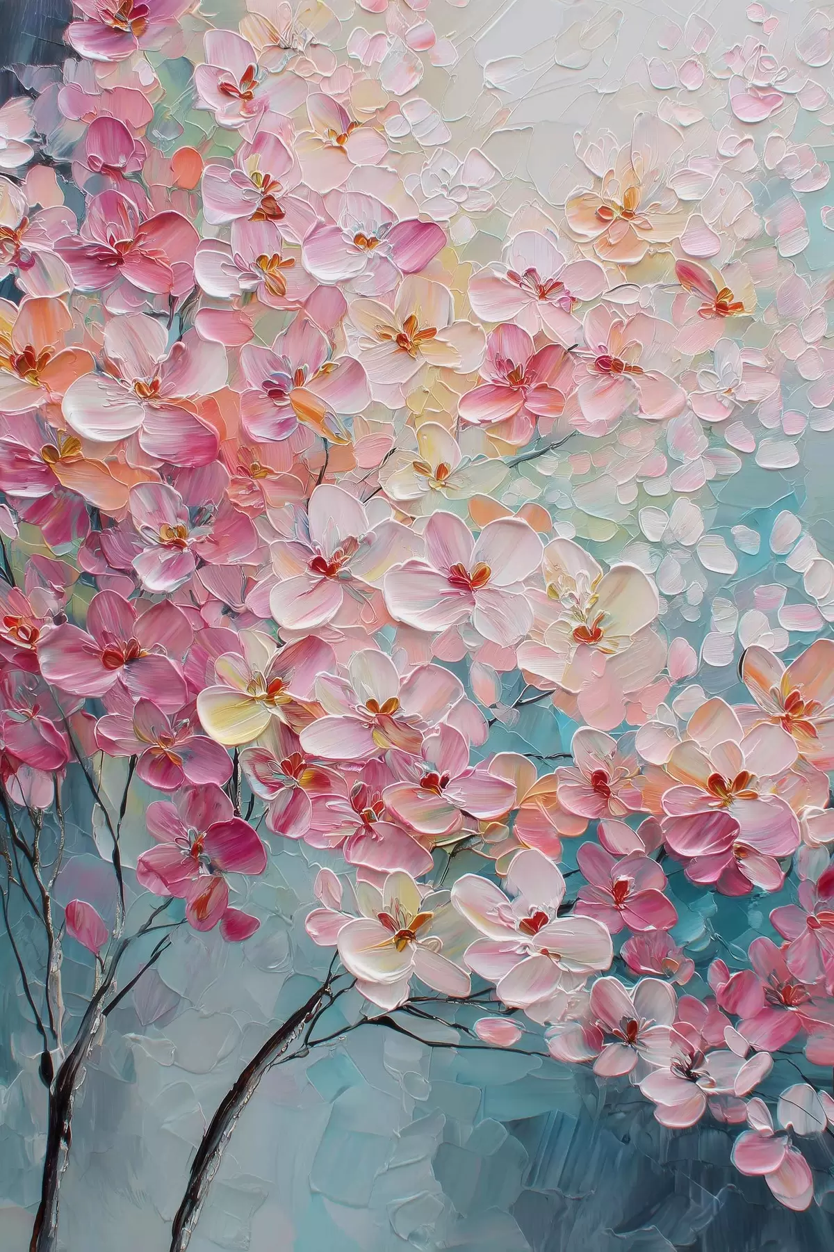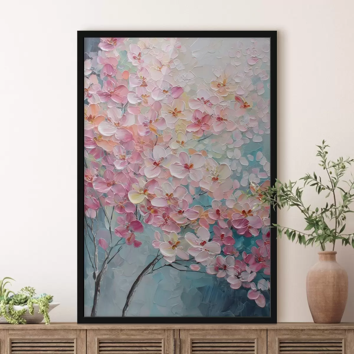 Poster Ramură cu flori roz pe fond albastru în stil pictură în ulei Nr f47987