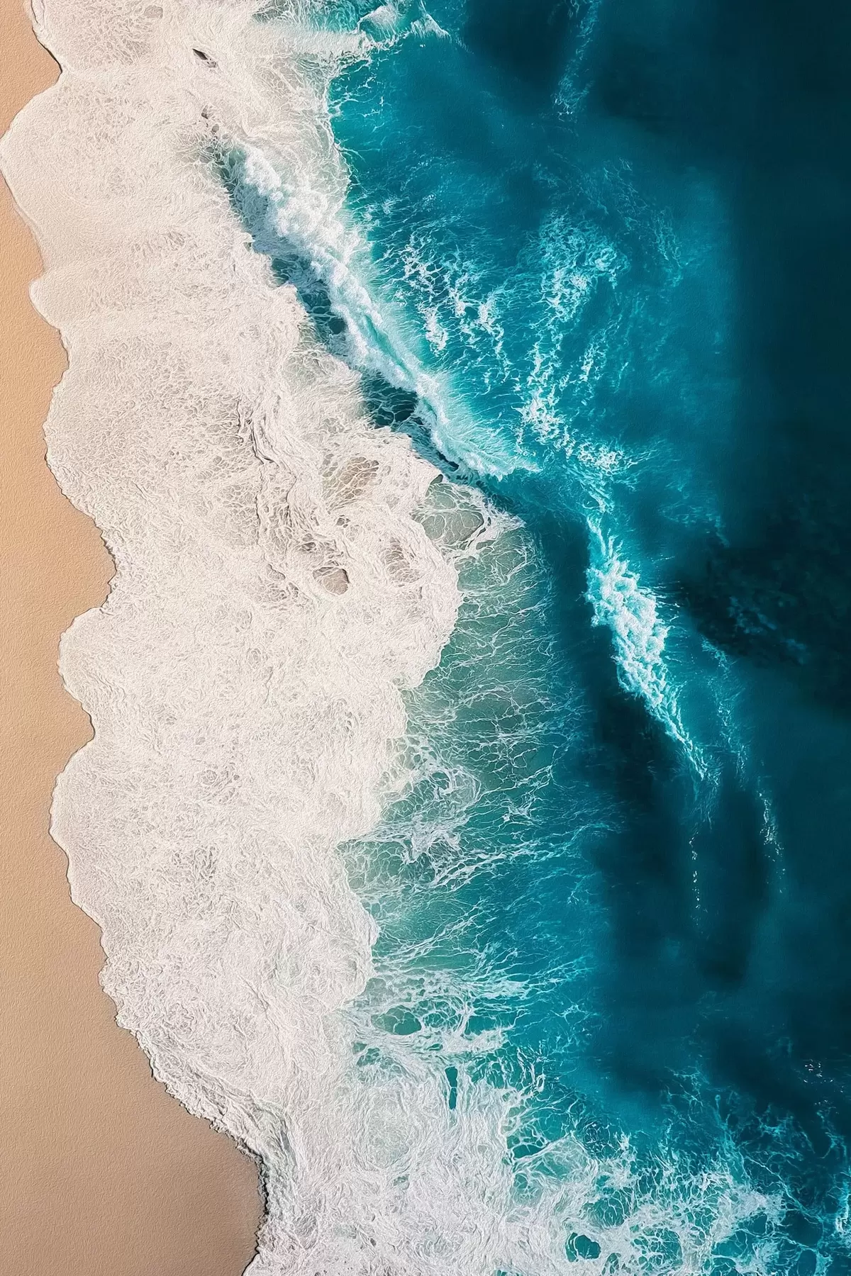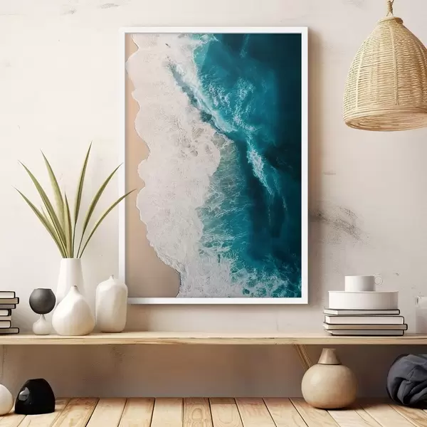Poster vedere aeriană de sus a valurilor oceanului care se întâlnesc cu plaja nisipoasă f48062