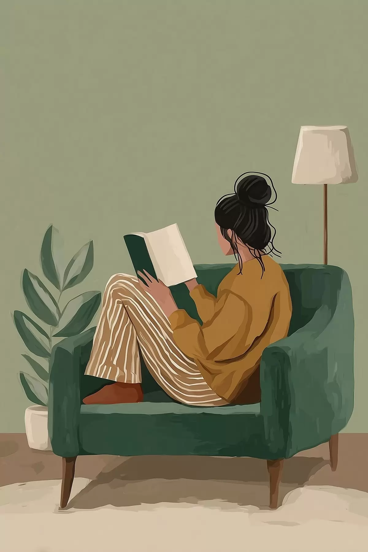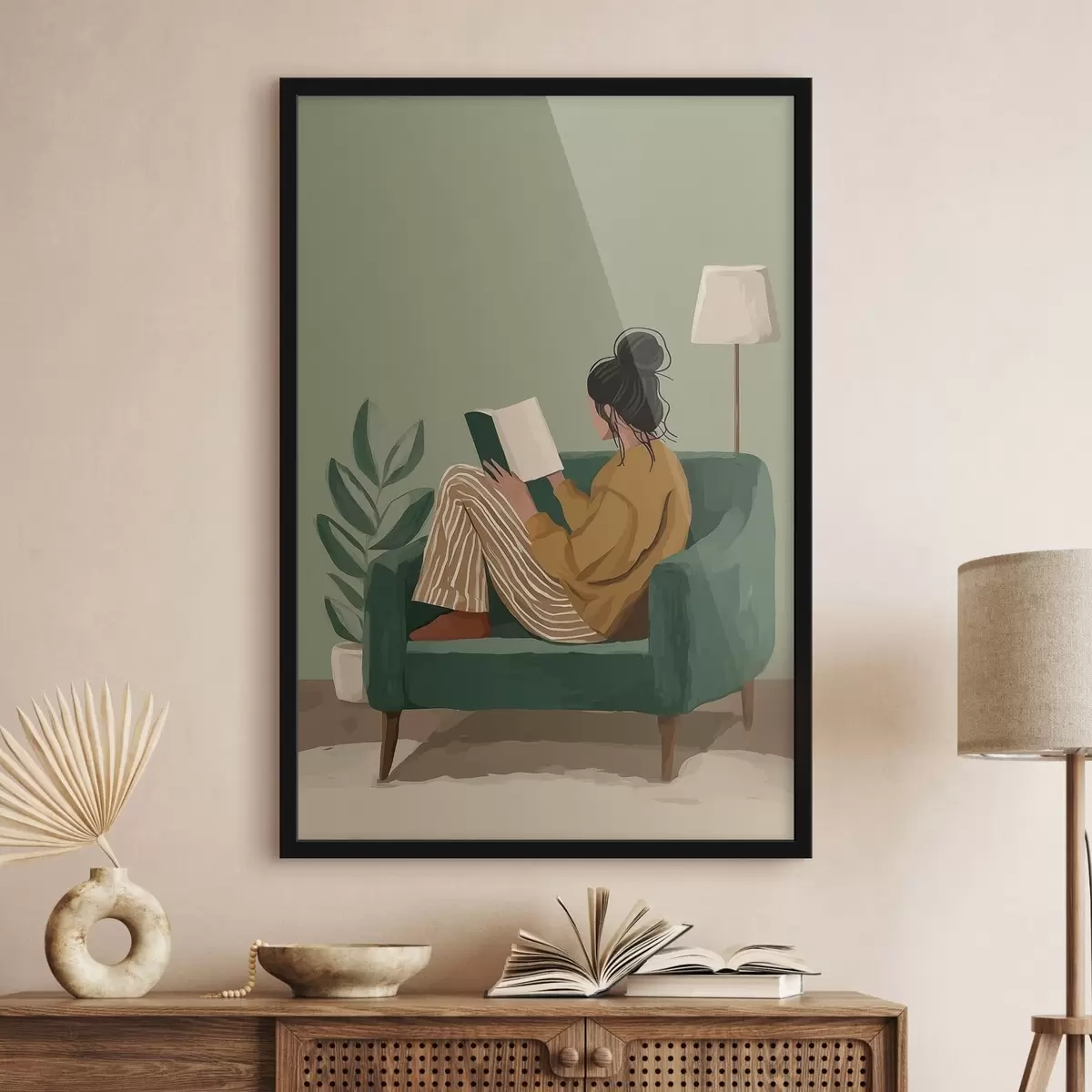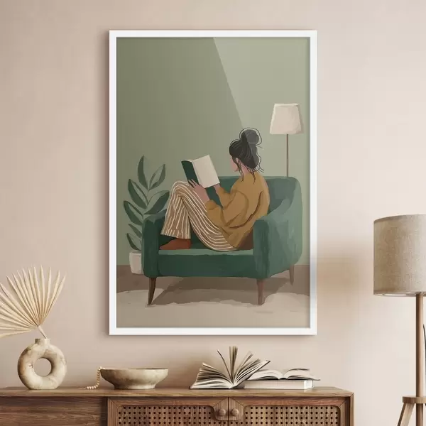 Poster ilustrație minimalistă și confortabilă a unei femei așezate într-un fotoliu, citind f48118