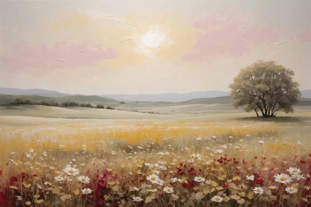 Poster Peisaj cu un câmp de flori și un copac la orizont Nr f48355