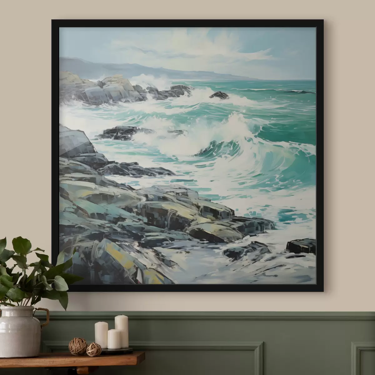 Poster Un peisaj cu țărm stâncos și valuri sub un cer înnorat, în stil pictural Nr f48388