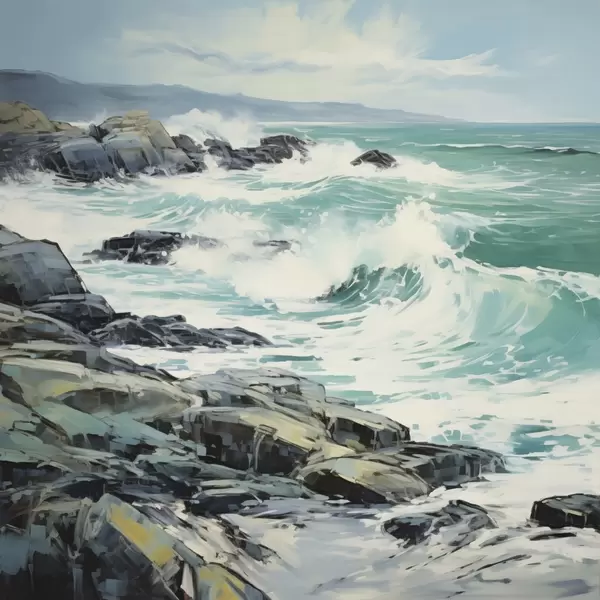 Poster Un peisaj cu țărm stâncos și valuri sub un cer înnorat, în stil pictural Nr f48388