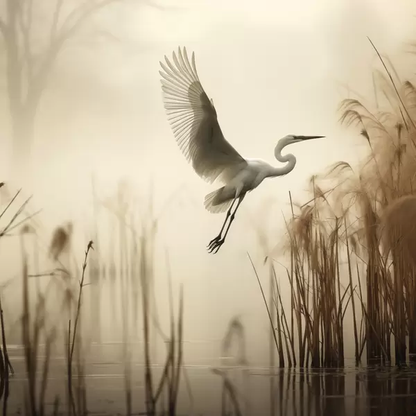 Poster O egretă albă zboară deasupra unui lac, înconjurată de stuf înalt și copaci în fundal Nr f48389