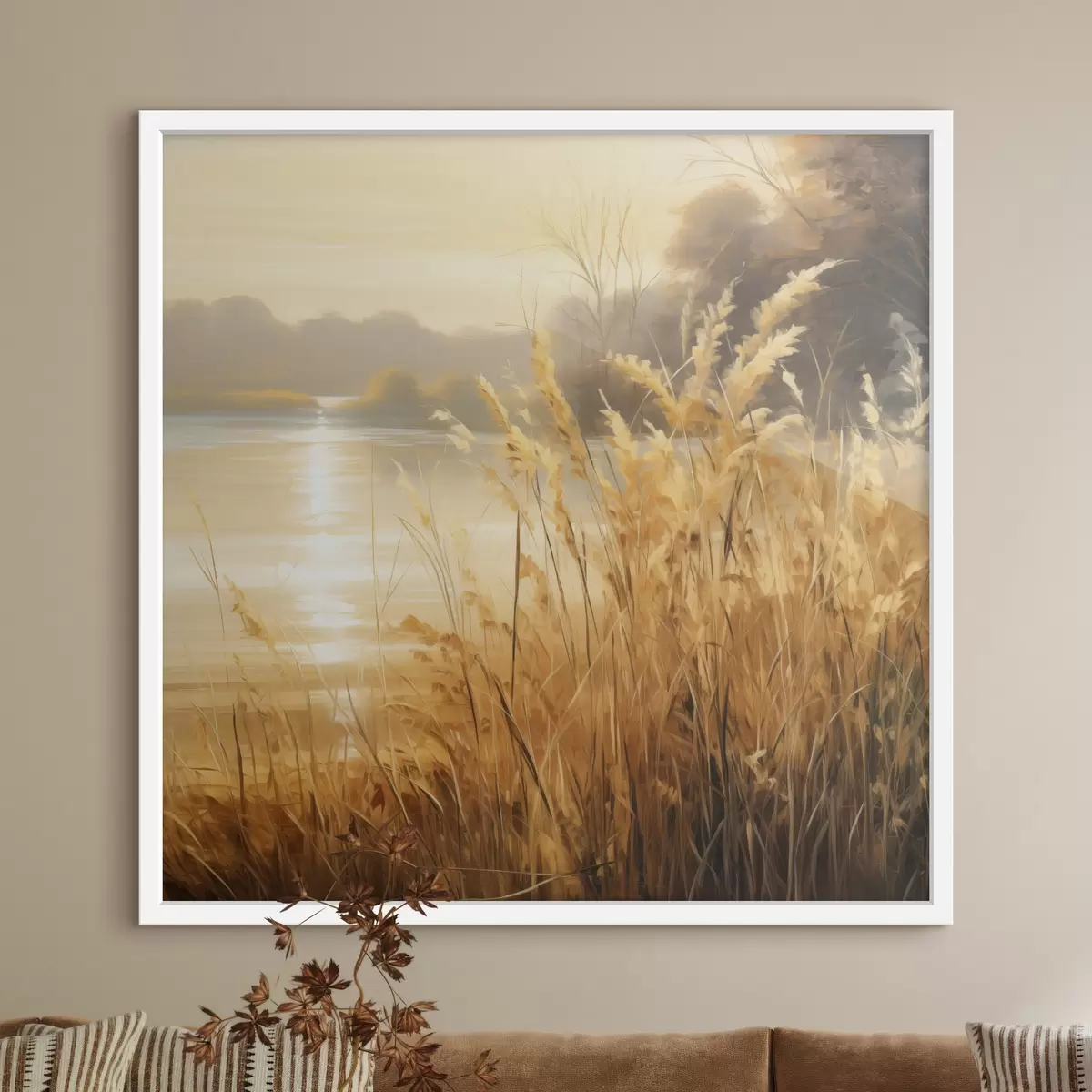 Poster Iarbă înaltă, cu spiculețe uscate, în prim-plan, cu un lac și copaci în fundal f48393