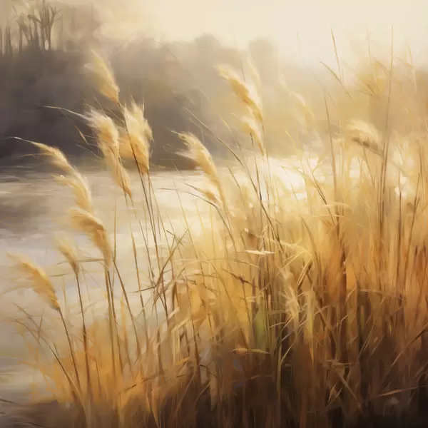 Poster Iarbă înaltă, cu spiculețe uscate, în prim-plan, cu un lac și copaci în fundal Nr f48394