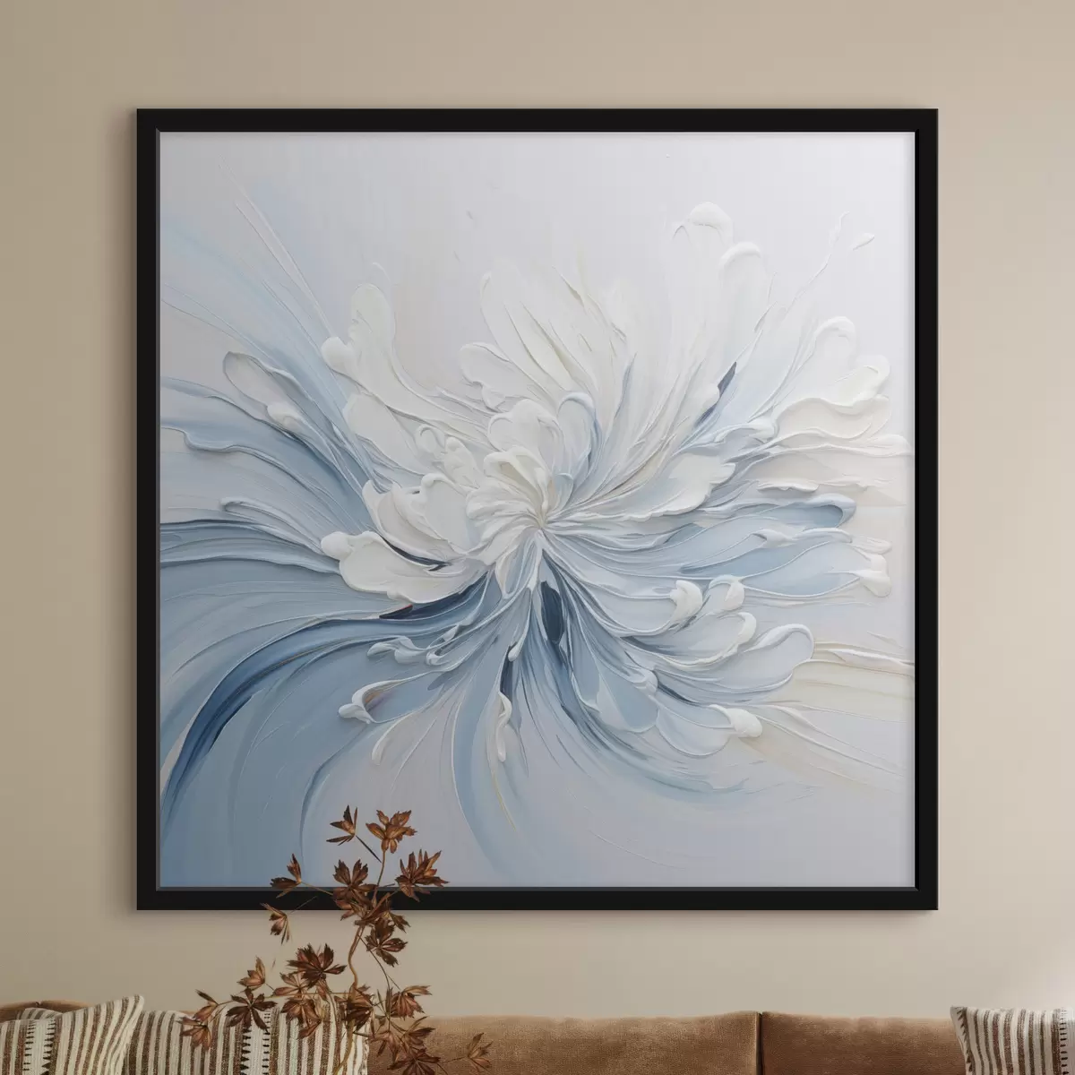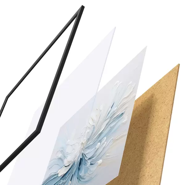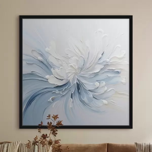 Poster Un model floral abstract în alb și albastru deschis, cu petale texturate și linii ondulate f48396