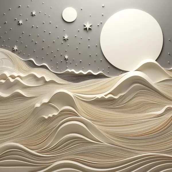 Poster Un peisaj minimalist stilizat, cu dealuri ondulate și o lună mare pe un cer înstelat, artă abstractă f48401