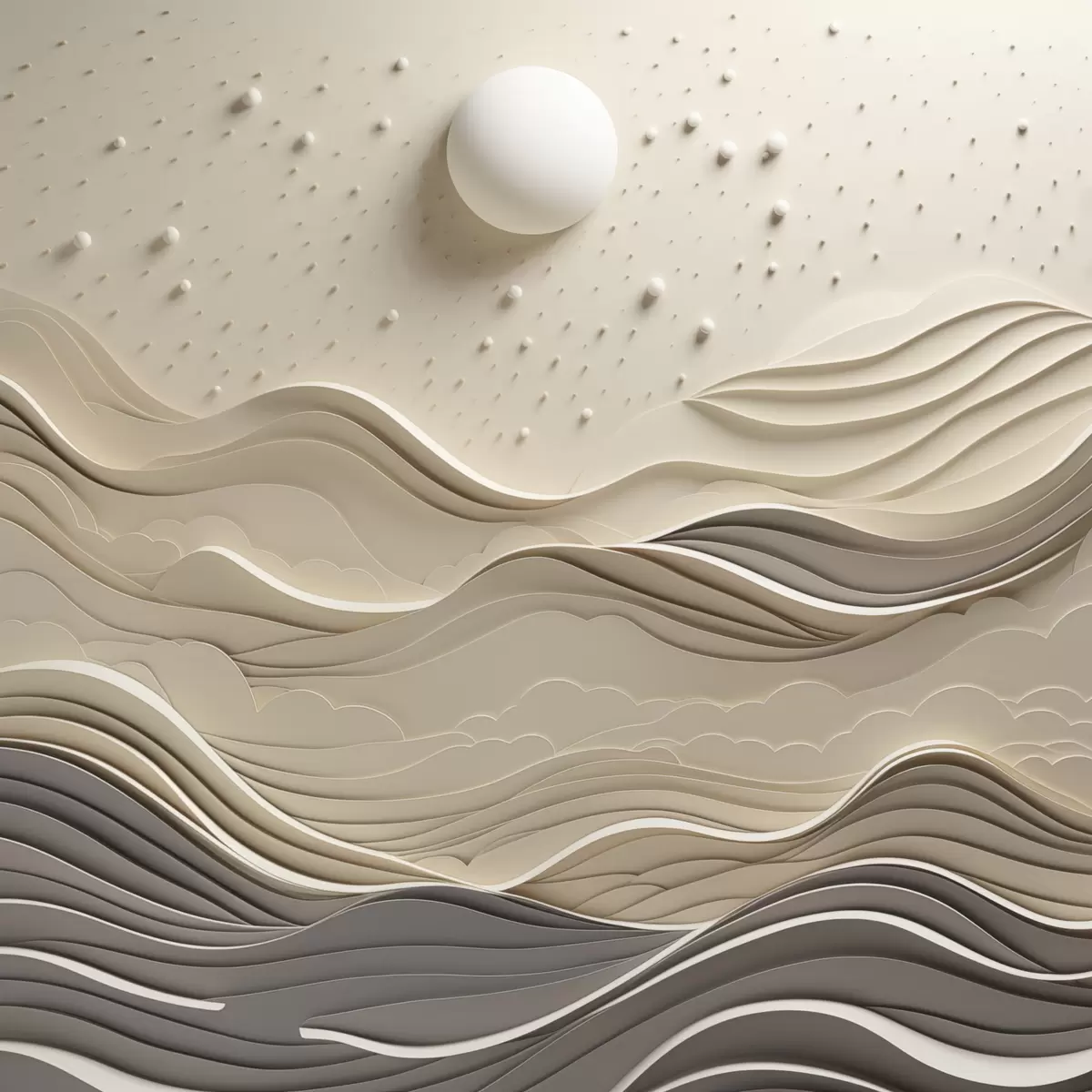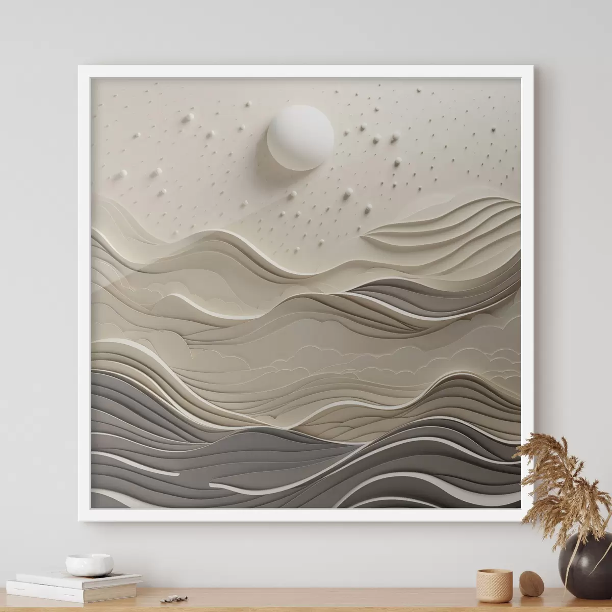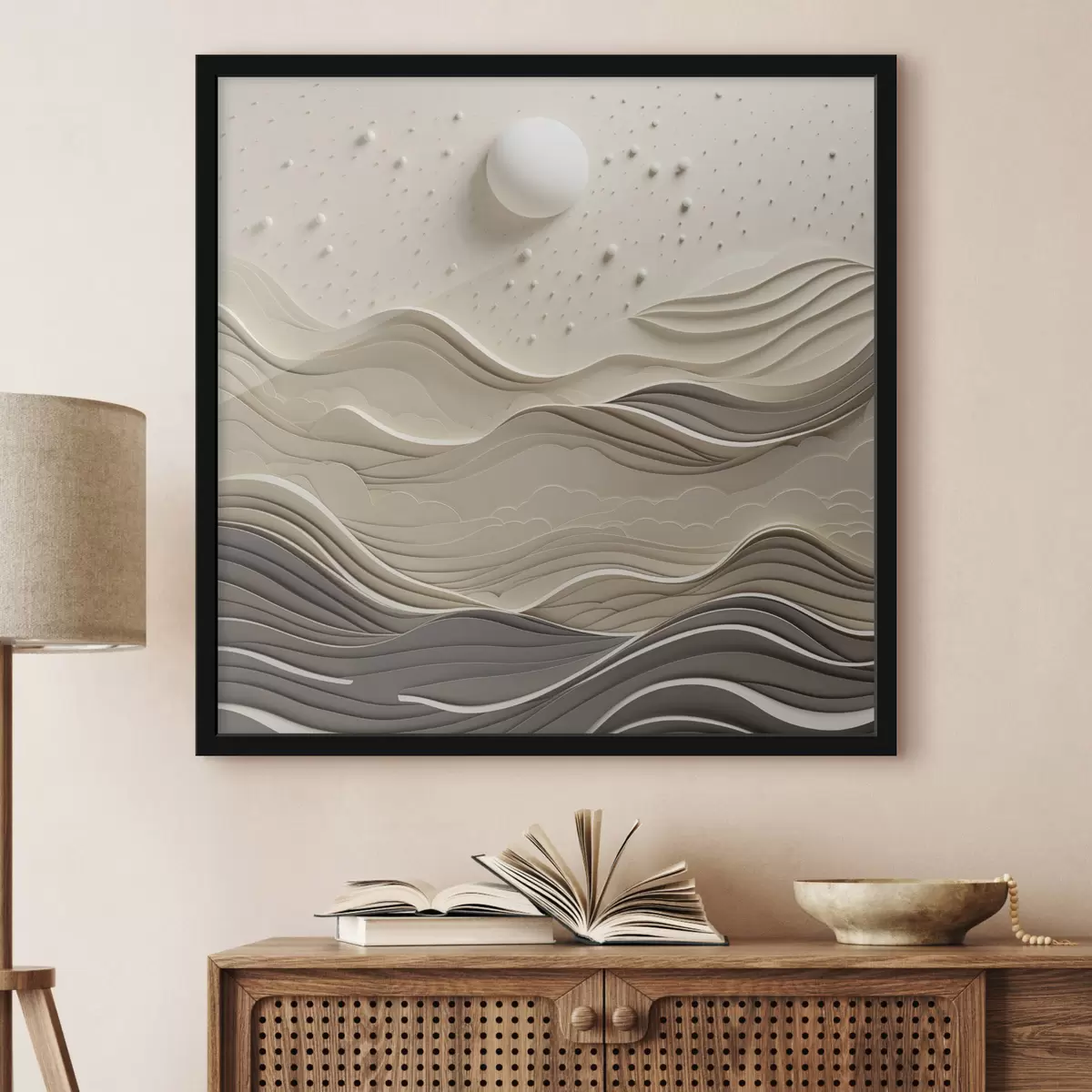 Poster Un peisaj minimalist stilizat, cu dealuri ondulate și o lună mare pe un cer înstelat, artă abstractă Nr f48402