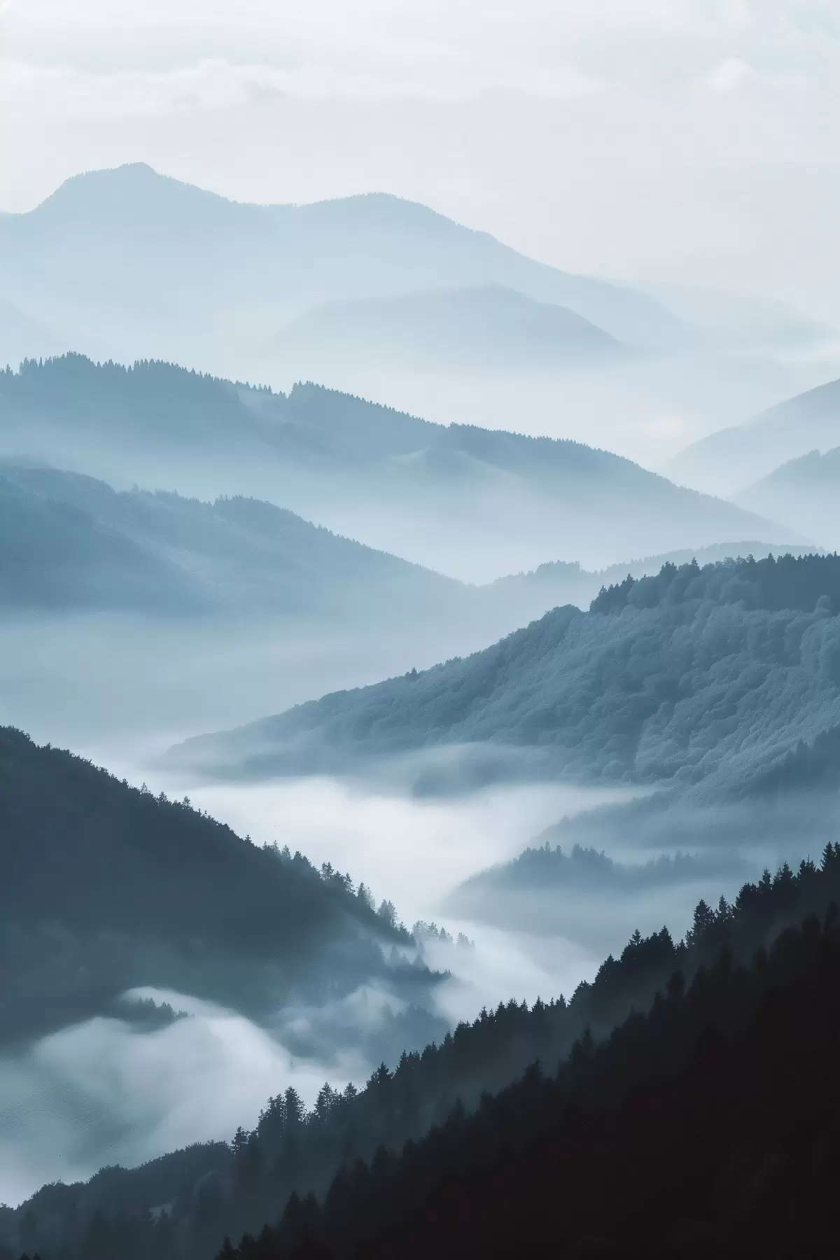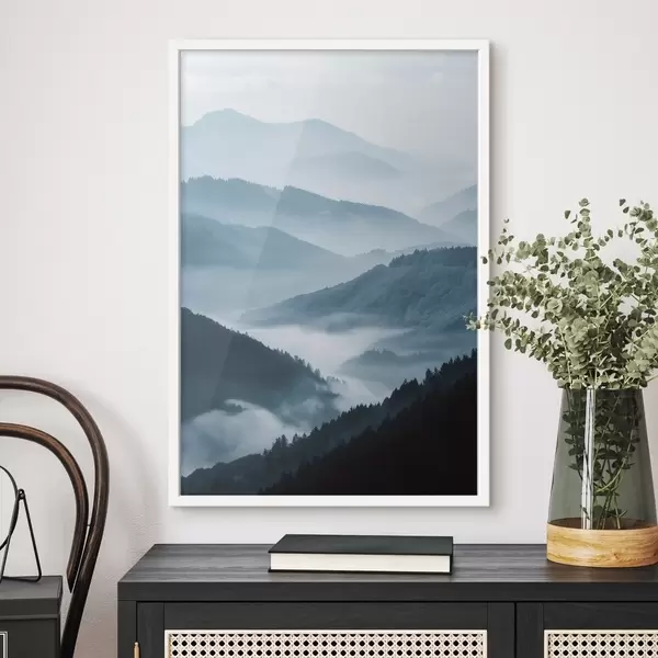 Poster Munți învăluiți în ceață, peisaj albastru Nr f48567