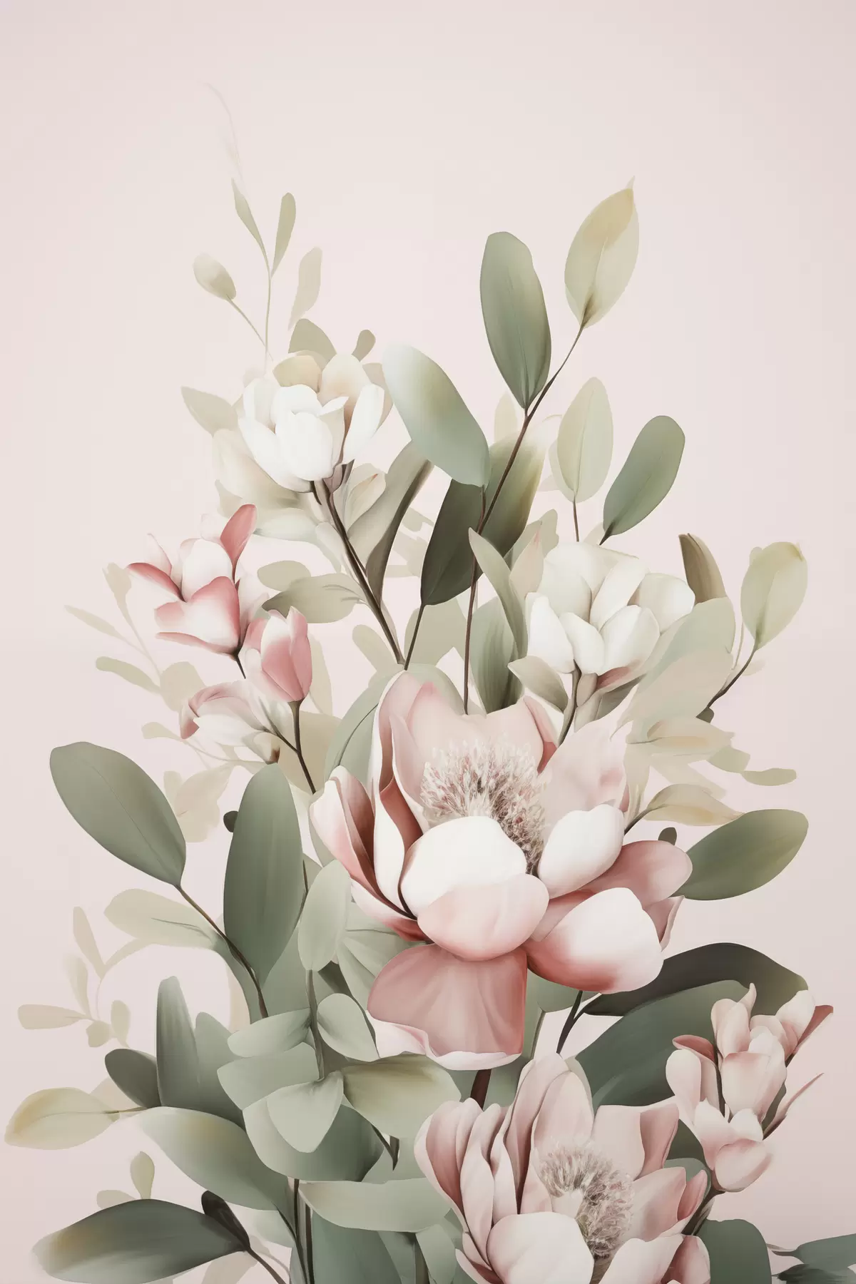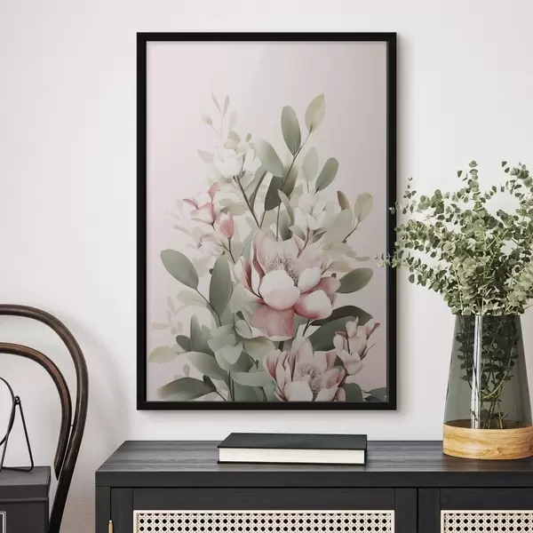 Poster Un buchet de flori în nuanțe pastelate, cu frunze de eucalipt, pe un fundal roz pal Nr f48727