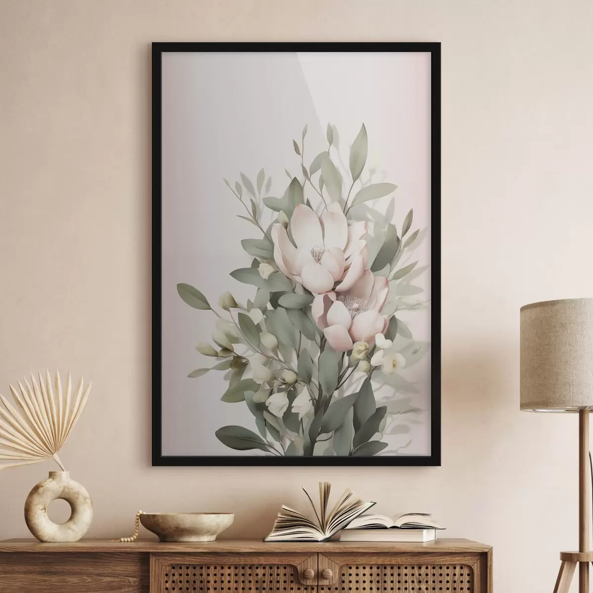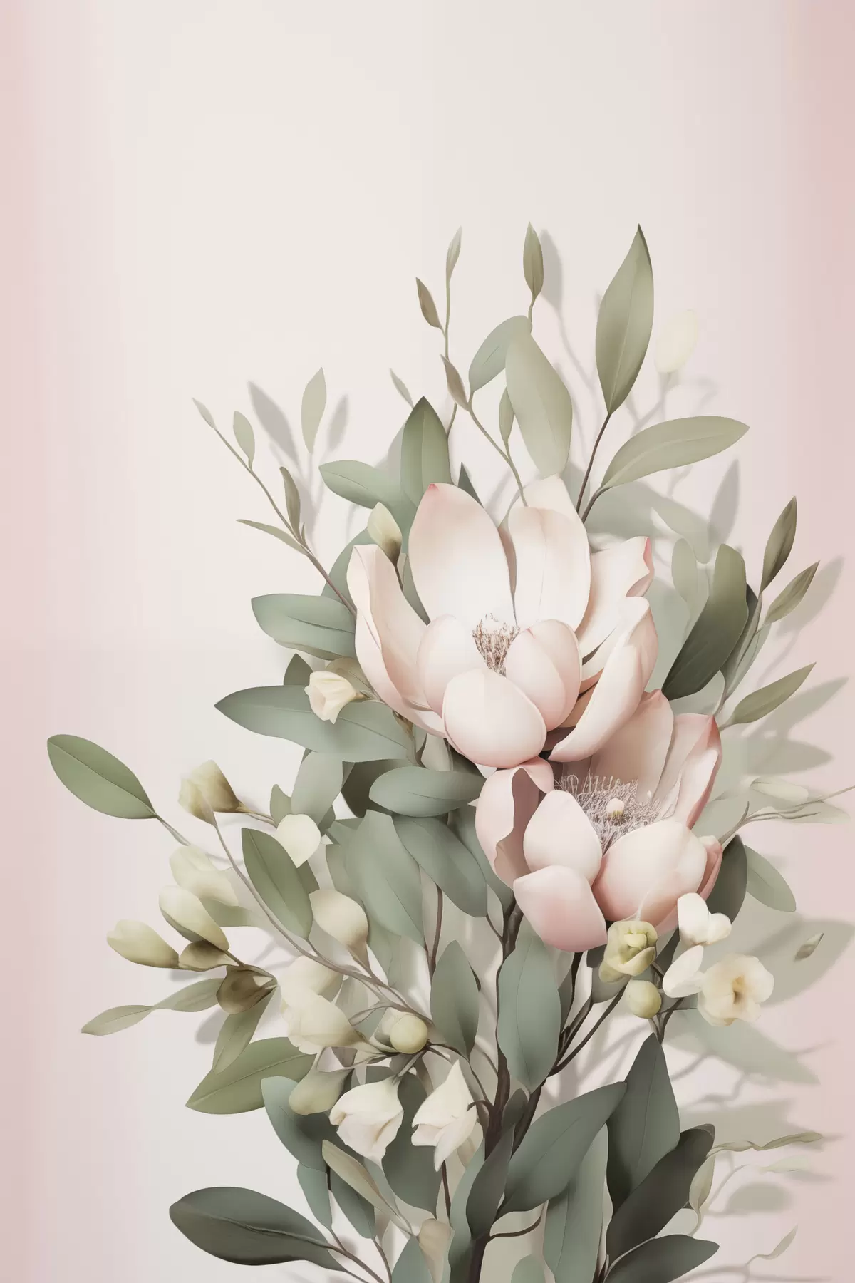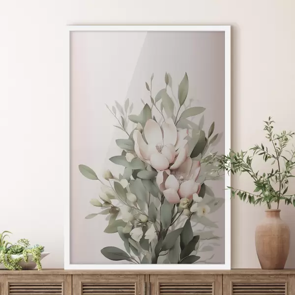 Poster Un buchet de flori în nuanțe pastelate, cu frunze de eucalipt, pe un fundal roz pal Nr f48728