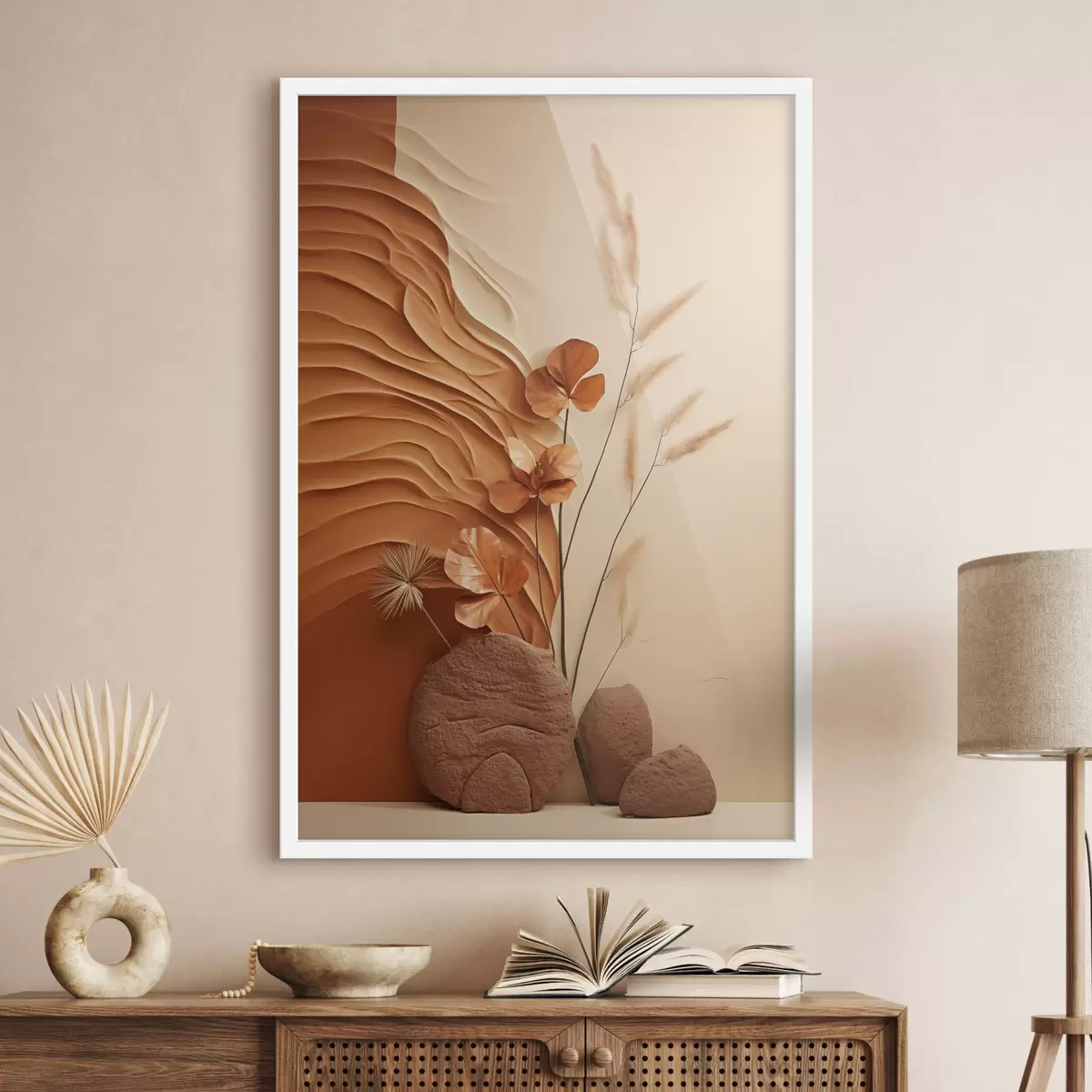 Poster O operă de artă minimalistă cu flori uscate și iarbă de pampas, pe un fundal texturat f48739