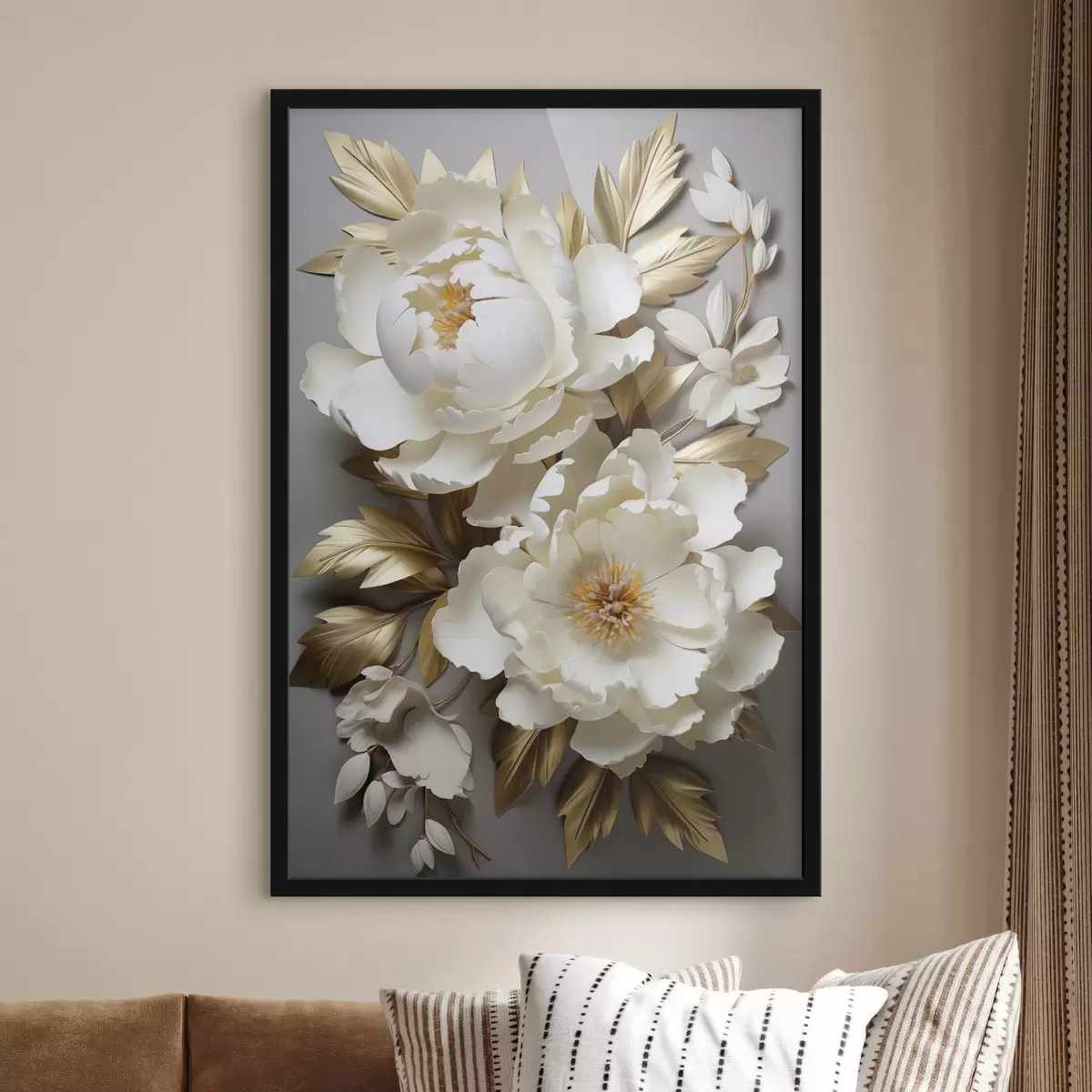 Poster Bujori albi mari cu frunze galbene pe un fundal gri f48753