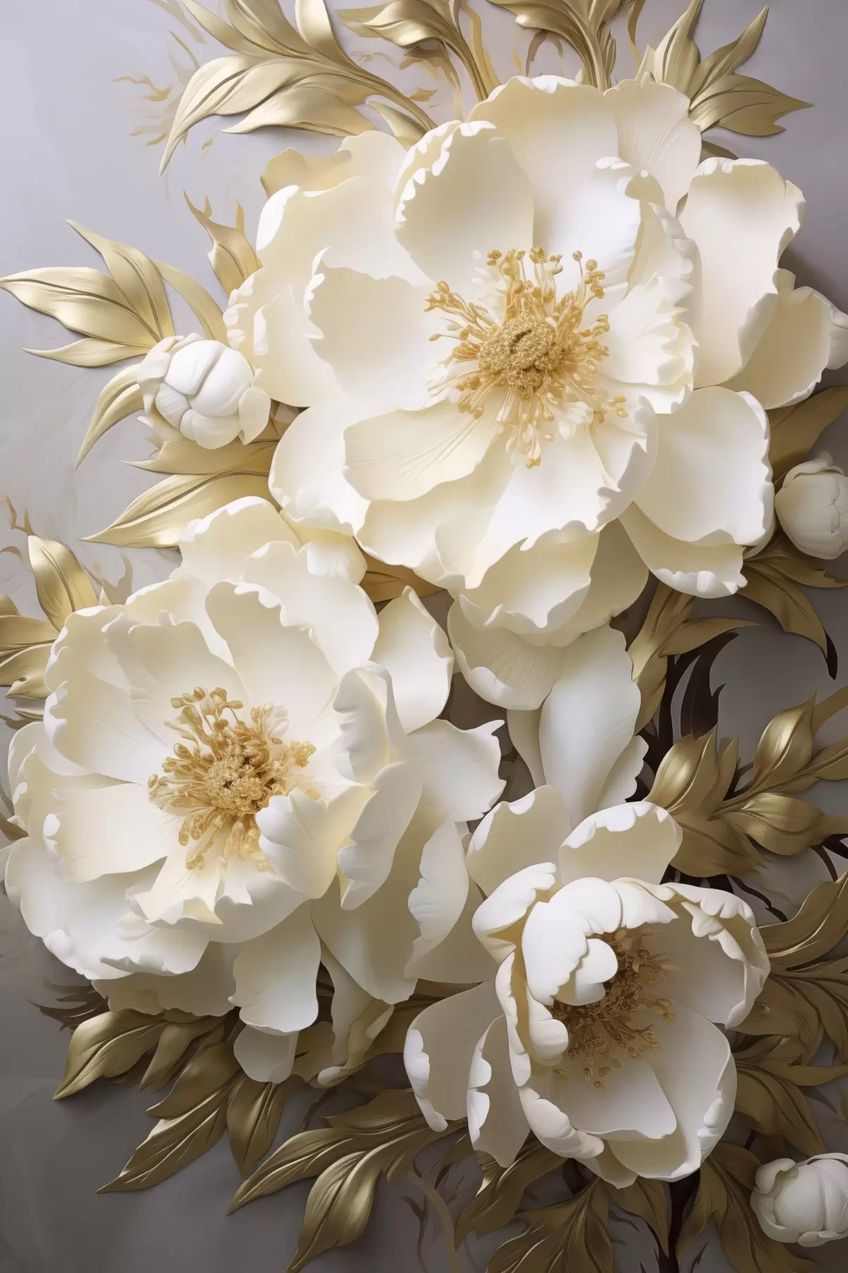Poster Bujori albi mari cu frunze galbene pe un fundal gri Nr f48754