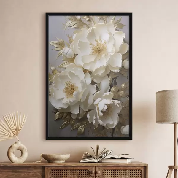 Poster Bujori albi mari cu frunze galbene pe un fundal gri f48754
