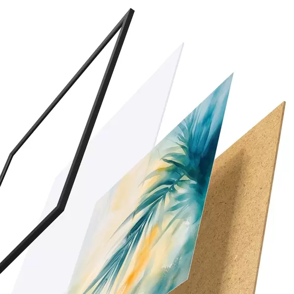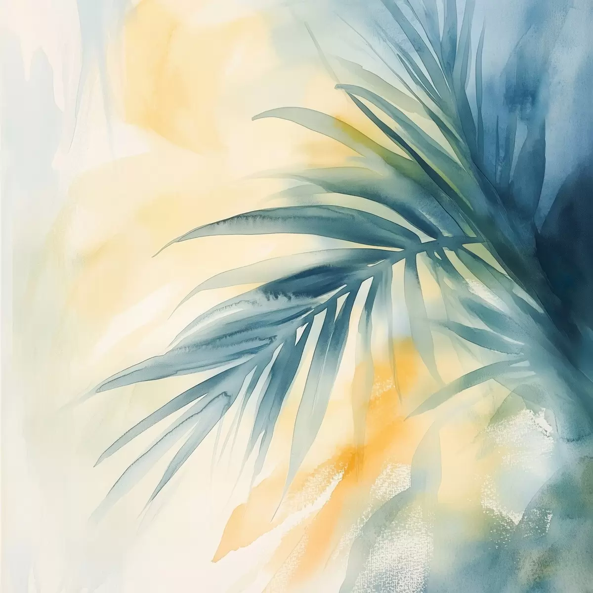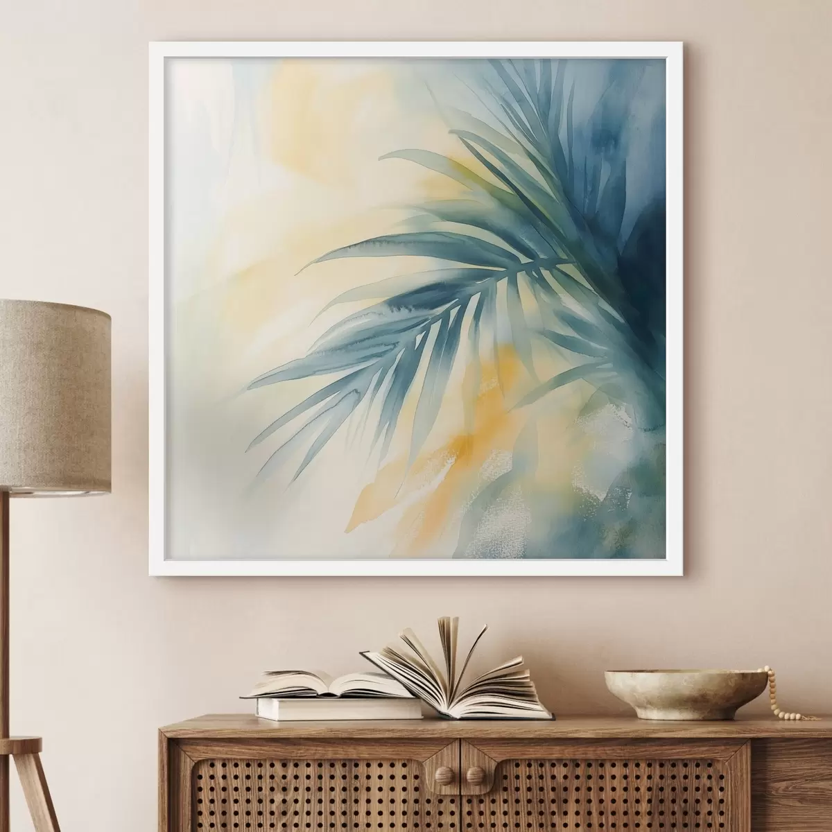 Poster Frunze de palmier tropicale într-o paletă de culori albastru-turcoaz, pe un fundal de pete calde de acuarelă Nr f48849
