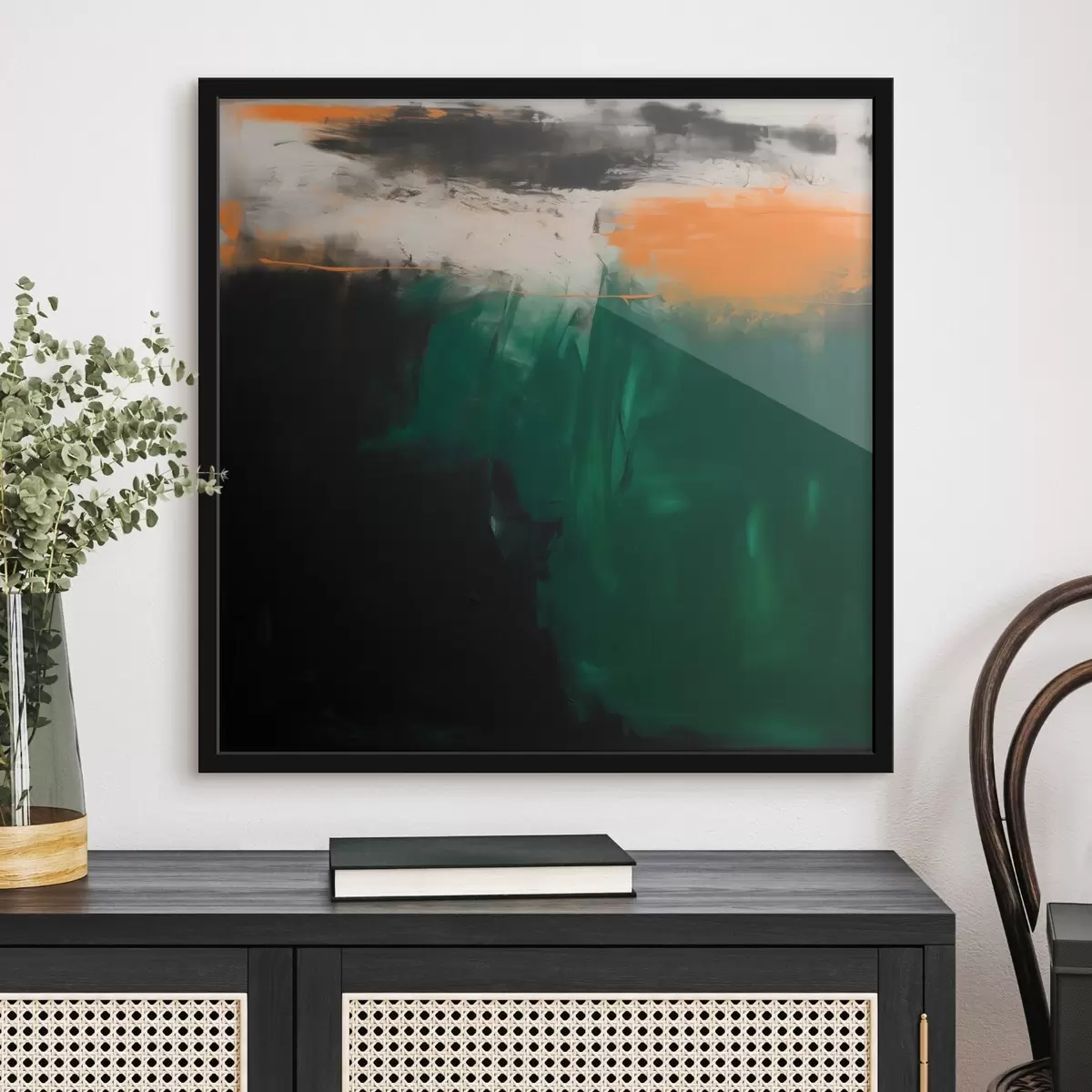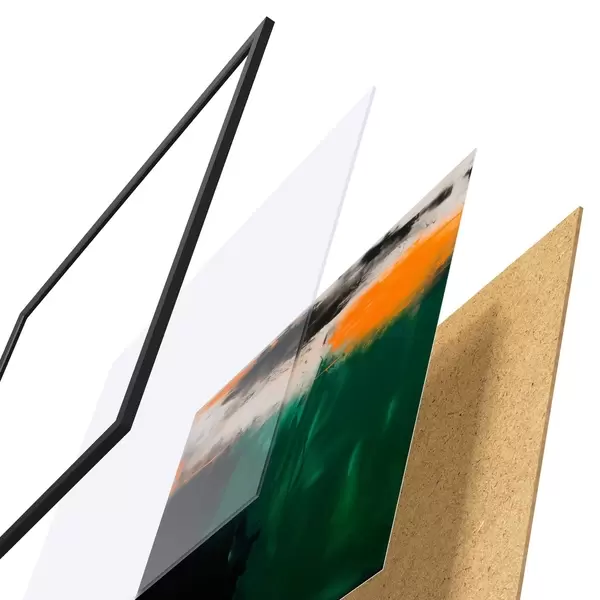 Poster O pictură abstractă cu accente portocalii și tușe de verde intens, realizată într-un stil contemporan Nr f48865
