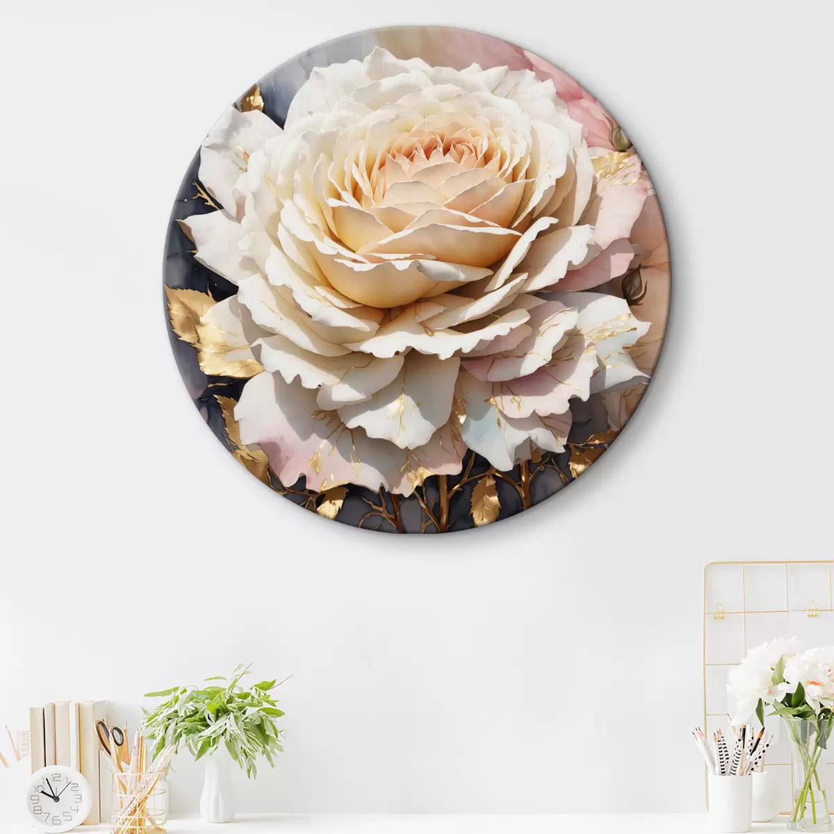 Picturi rotunde Trandafir alb în acuarelă cu frunze Nr r35662
