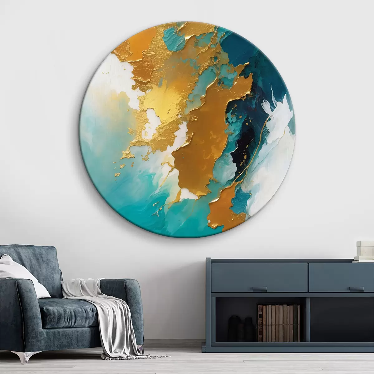 Picturi rotunde Teal și chihlimbar compoziție fluidă abstractă r35823