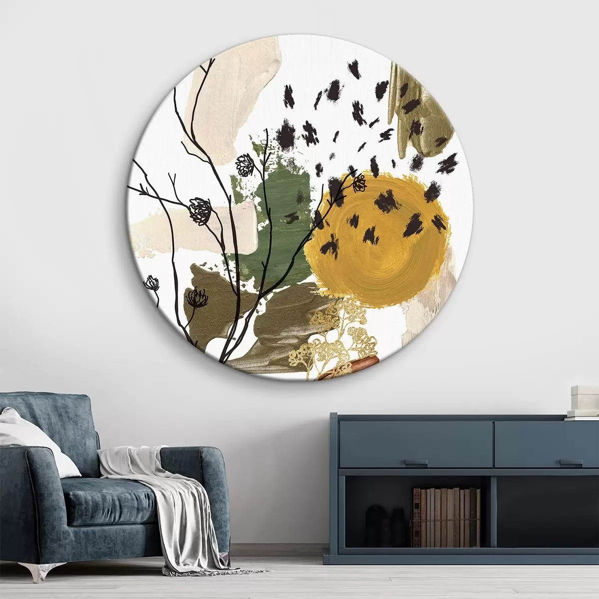 Picturi rotunde Compoziție de toamnă în acuarelă din ramuri liniare, pete maro, galbene și verzi. r35950