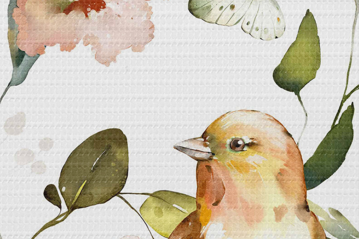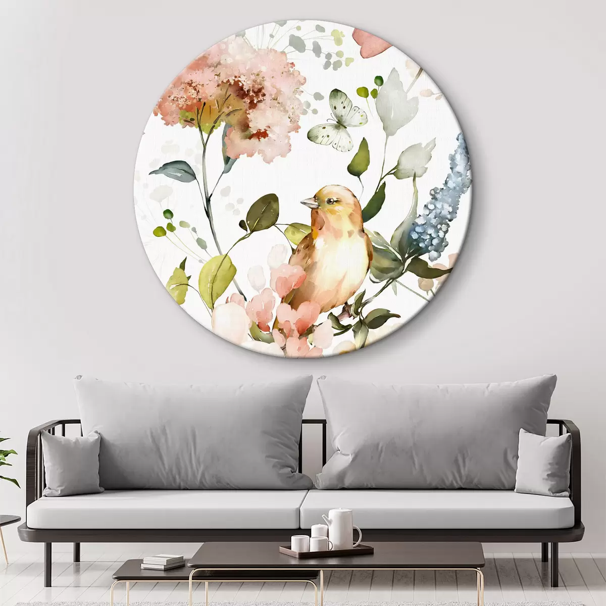 Picturi rotunde Acuarelă reprezentând flori, păsări și fluturi pe un fundal alb Nr r36153