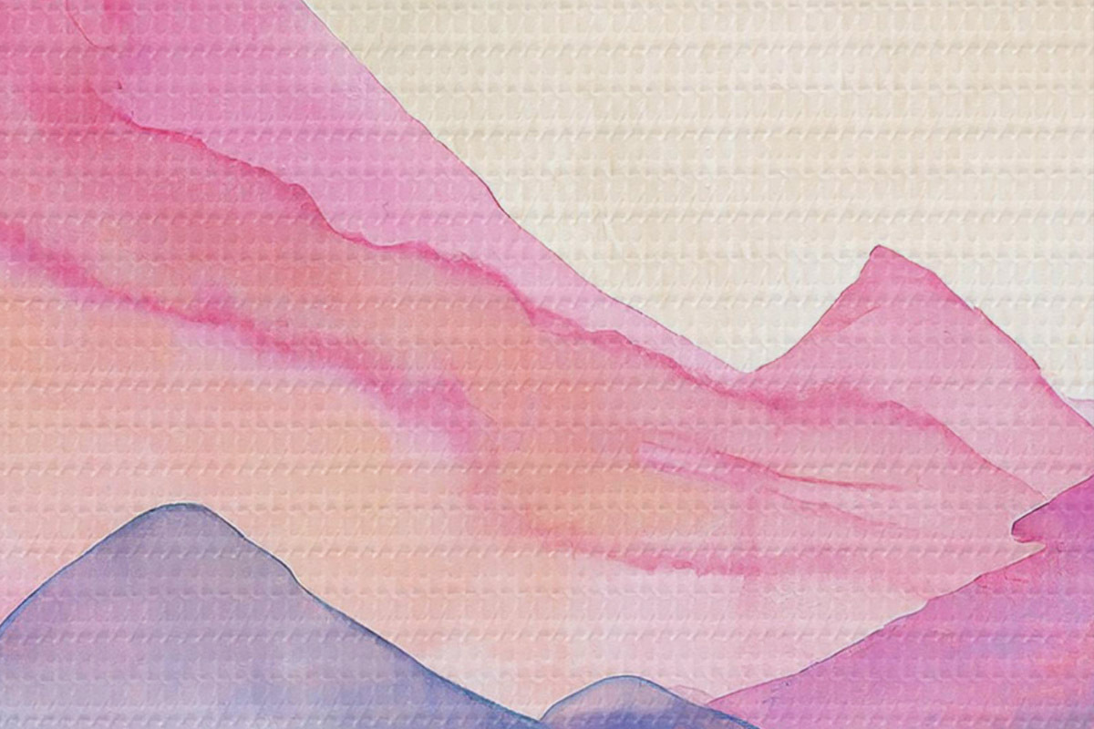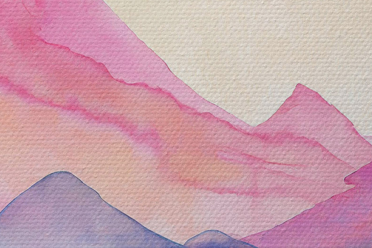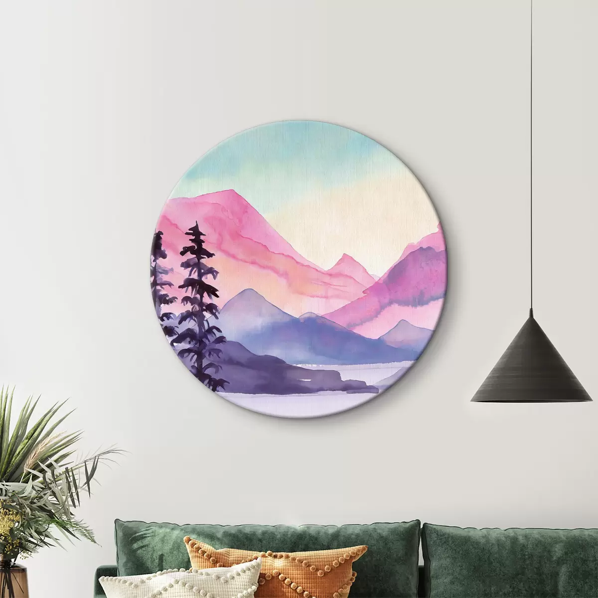 Picturi rotunde Peisaj montan acuarelă, răsărit de soare, Soft violet, roz și albastru culori Nr r36496