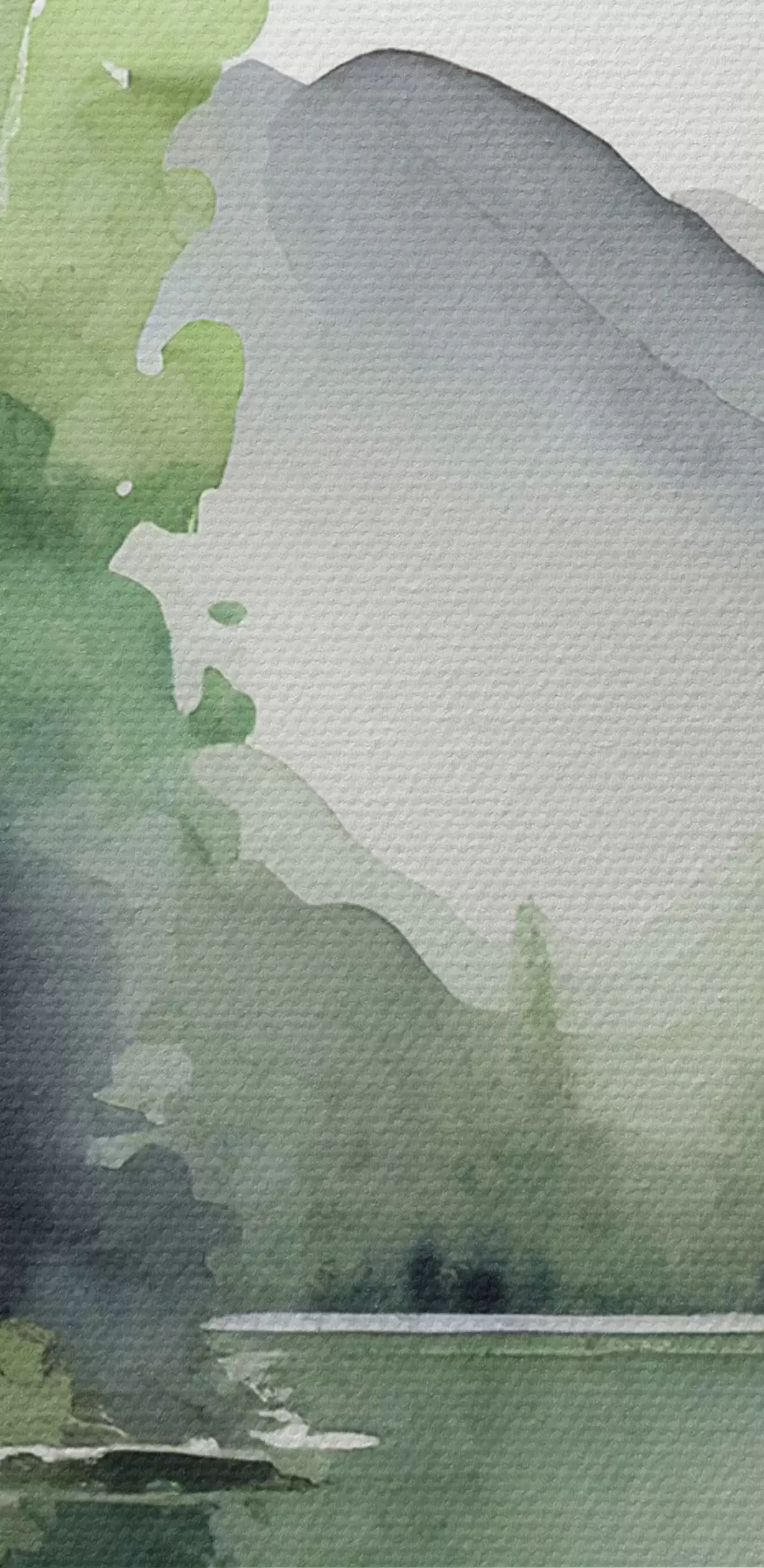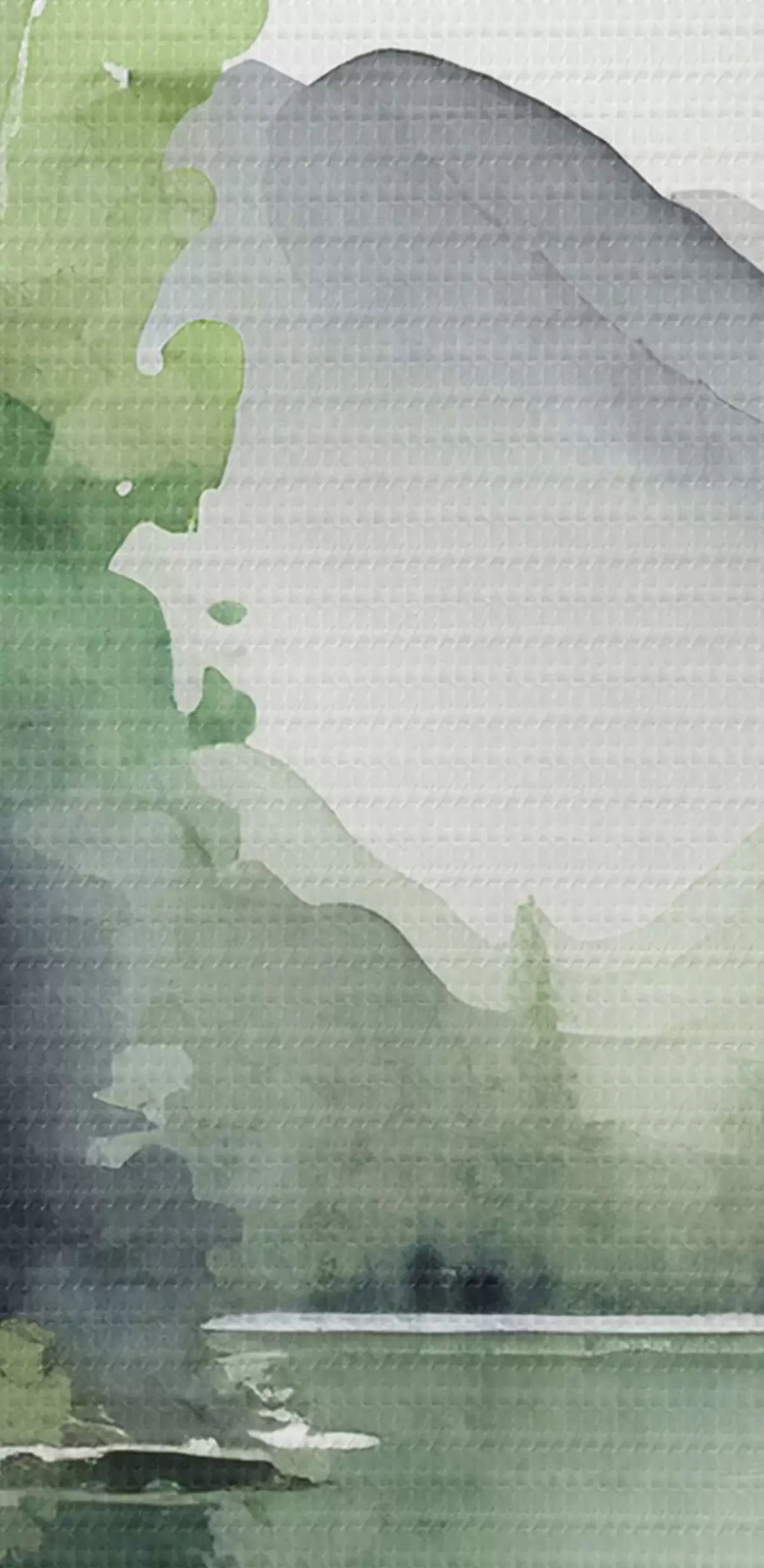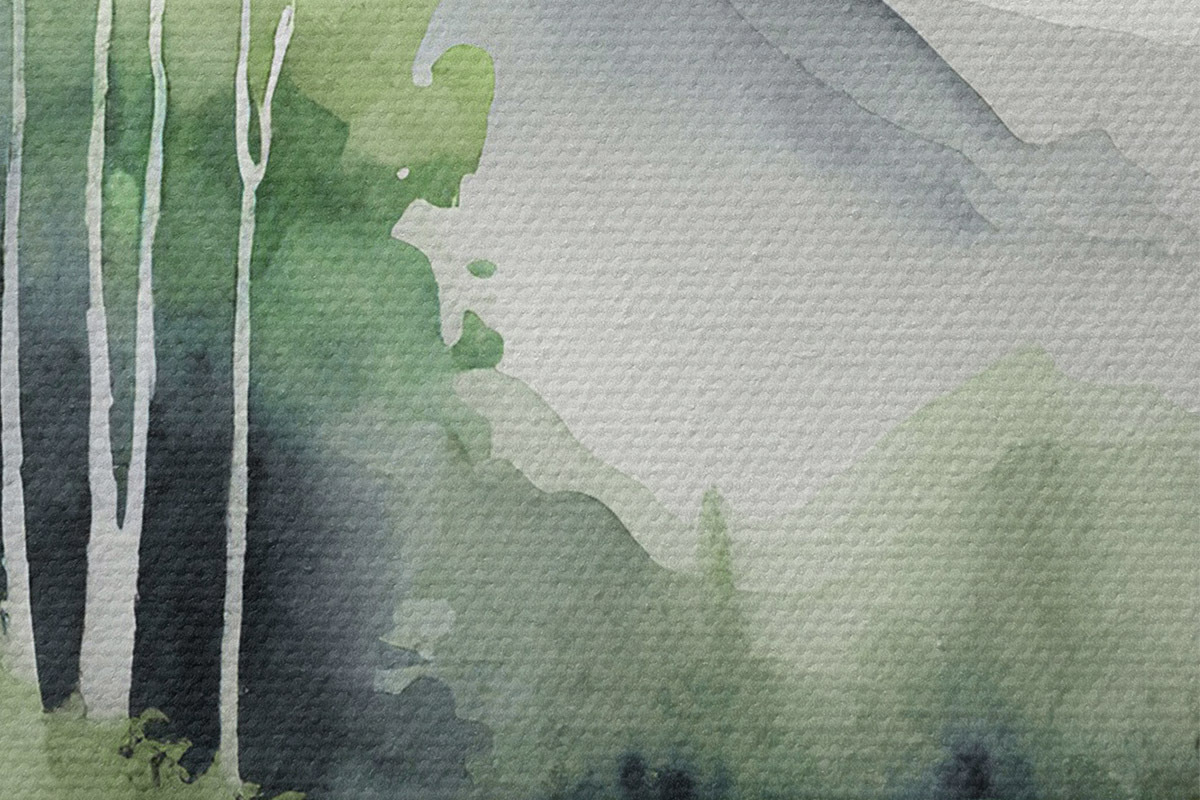 Picturi rotunde Peisaj acuarelă de lac și pădure, primăvară, verde natural culori moi r36503