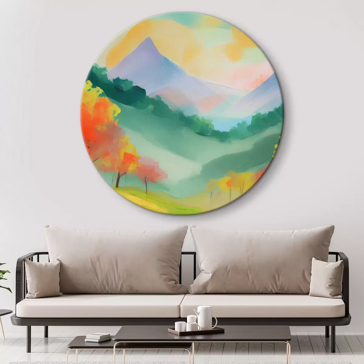 Picturi rotunde Desen acrilic Peisaj natural, culori apus de soare, munți, copaci, pajiște Nr r36505