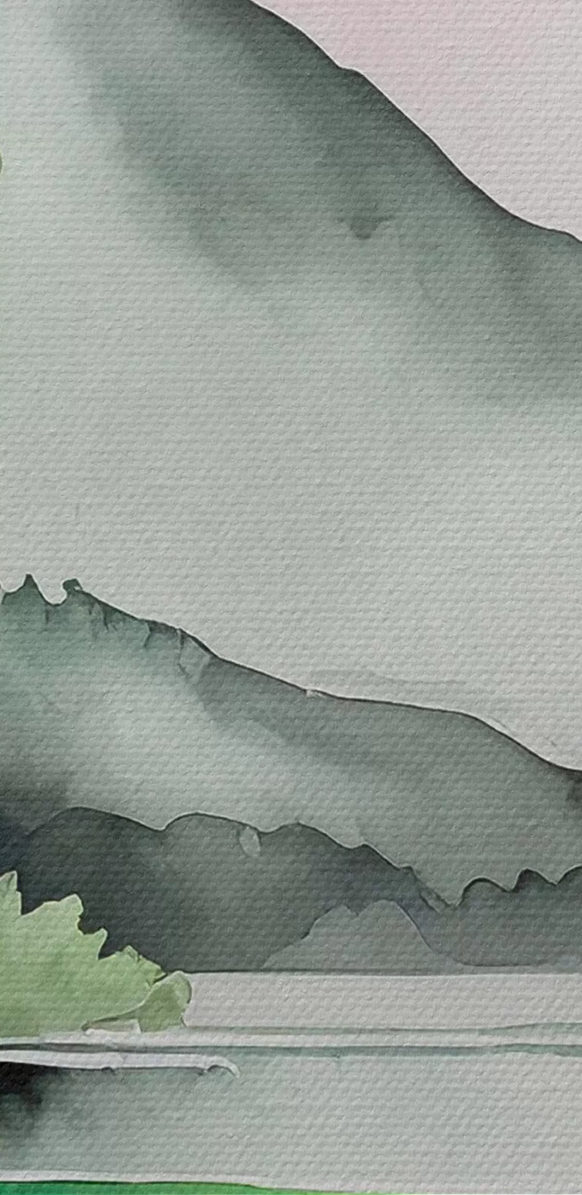 Picturi rotunde Acuarelă peisaj natural, lac și pădure, moale verde, roz și gri culori Nr r36507