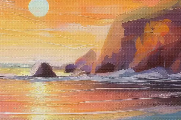 Picturi rotunde Răsărit de soare pe coastă, valuri marine, tușe de perie vii, acrilic Nr r36581