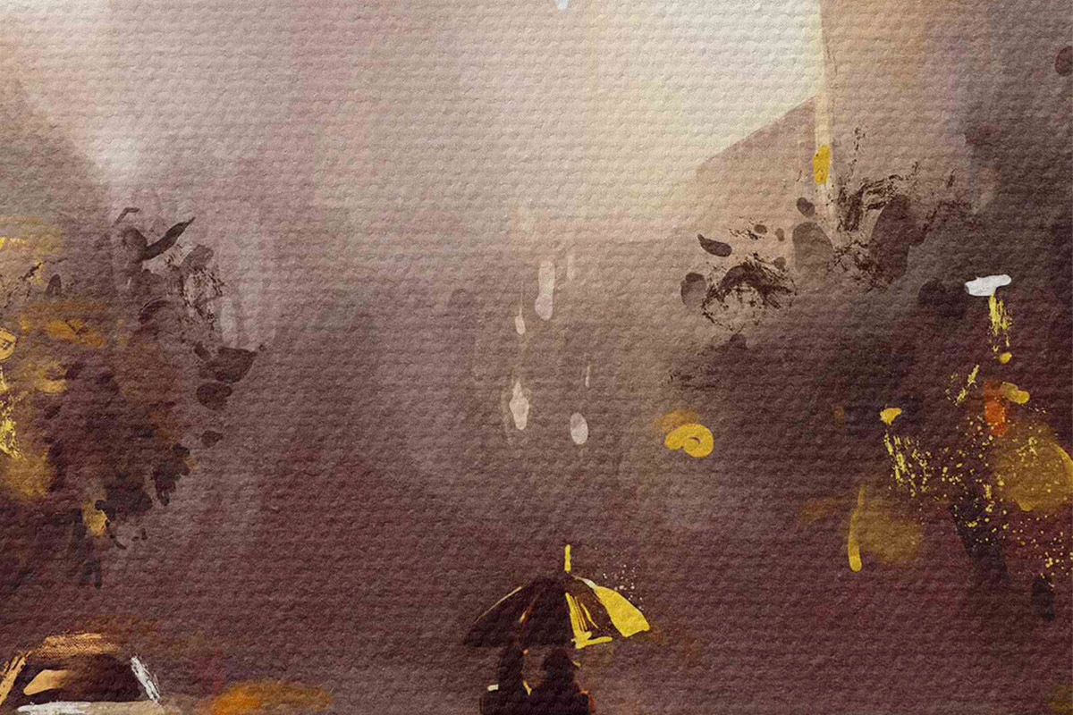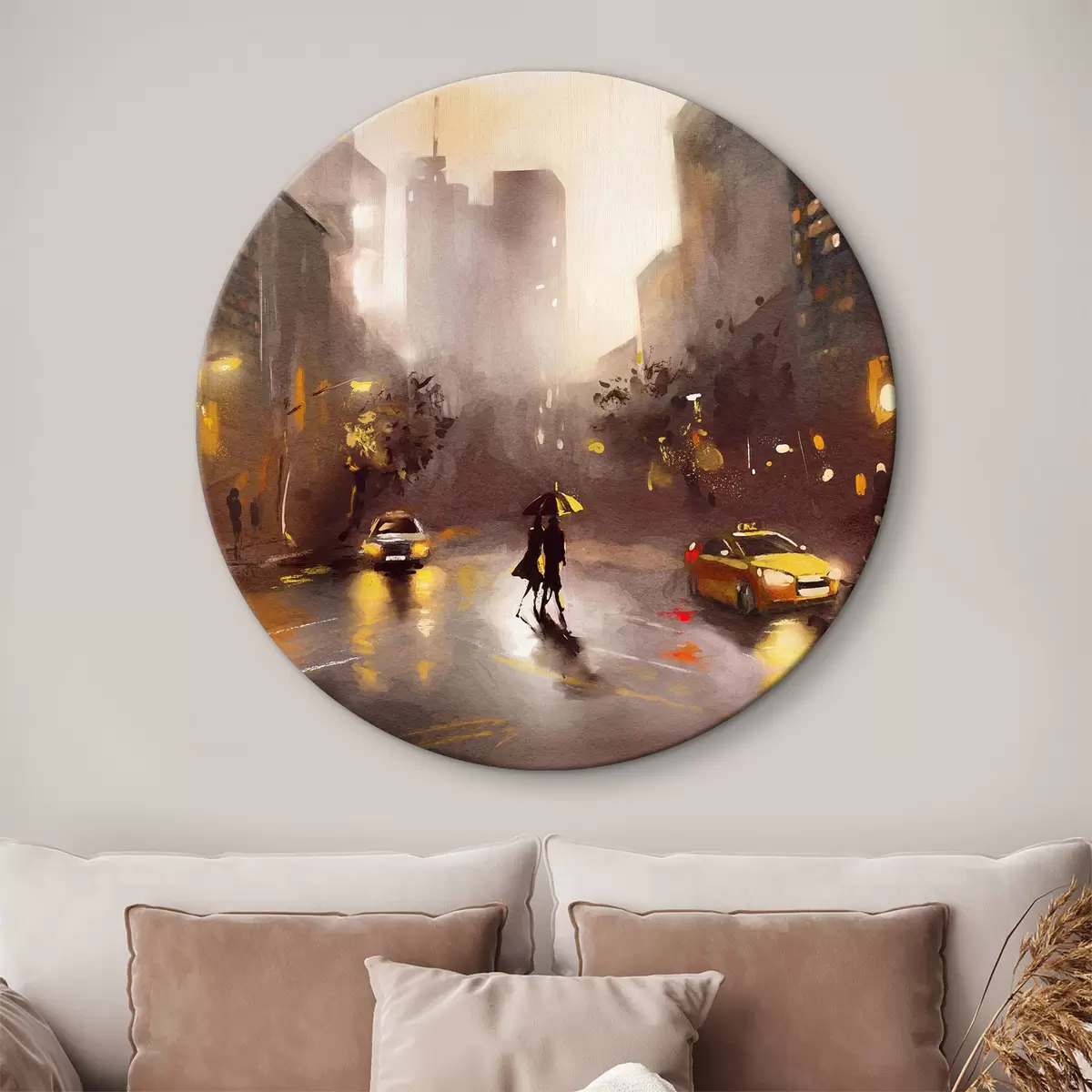 Picturi rotunde Persoană cu umbrelă mergând pe o stradă umedă cu mașini și clădiri Nr r36600