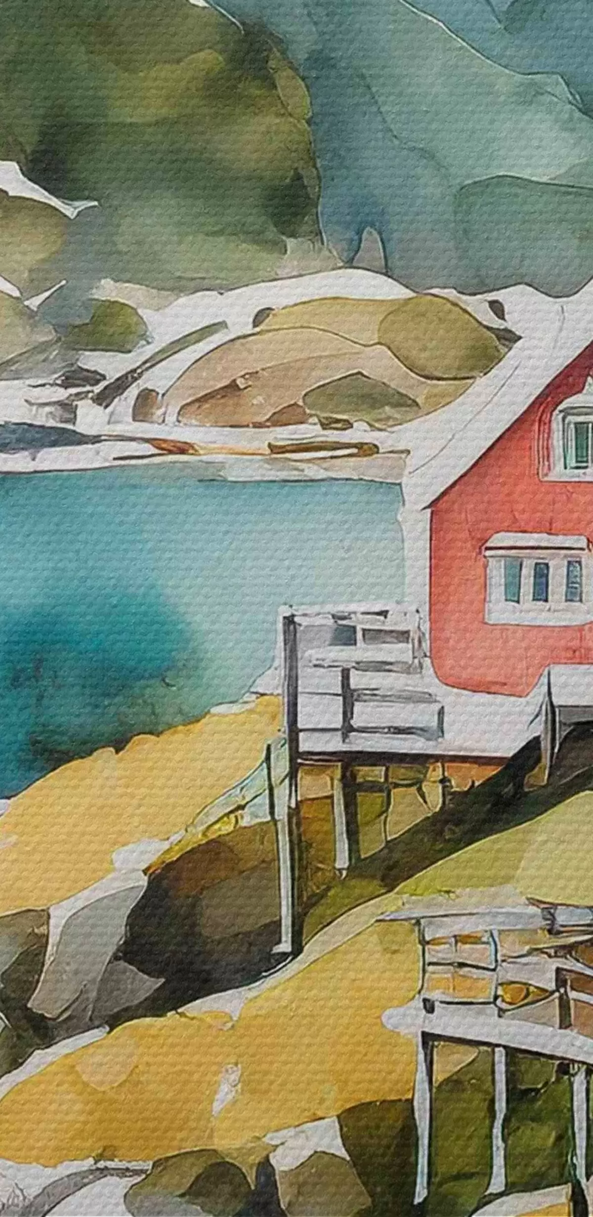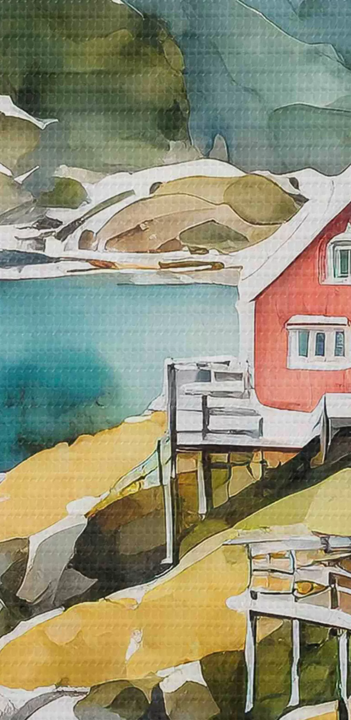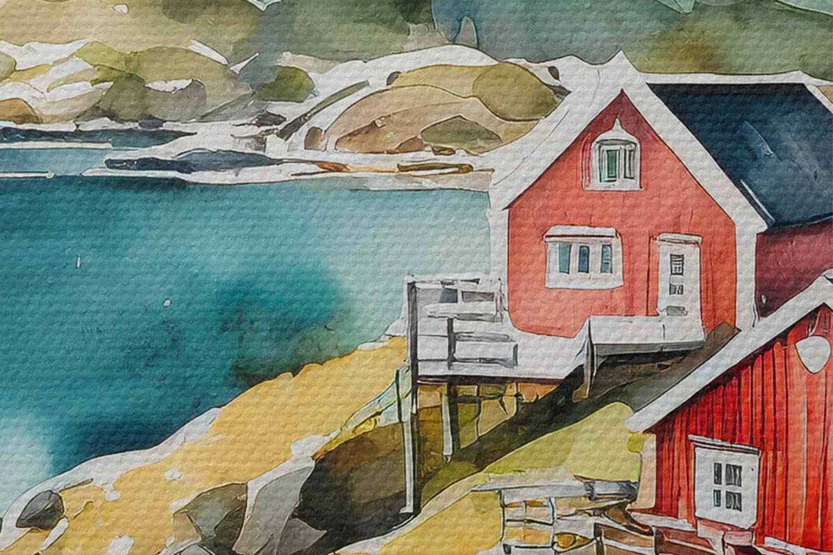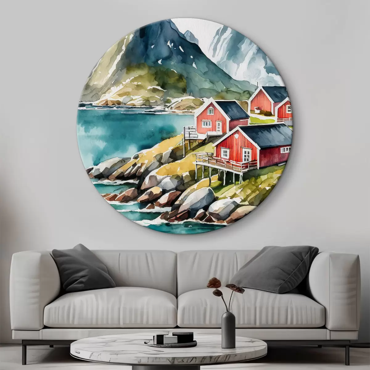 Picturi rotunde Acuarelă de case pe un deal lângă un rezervor Nr r36678