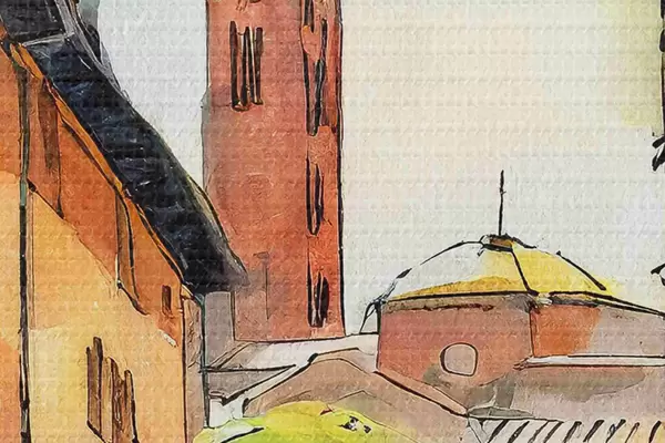 Picturi rotunde O pictură în acuarelă a unei străzi cu clădiri și copaci Nr r36684